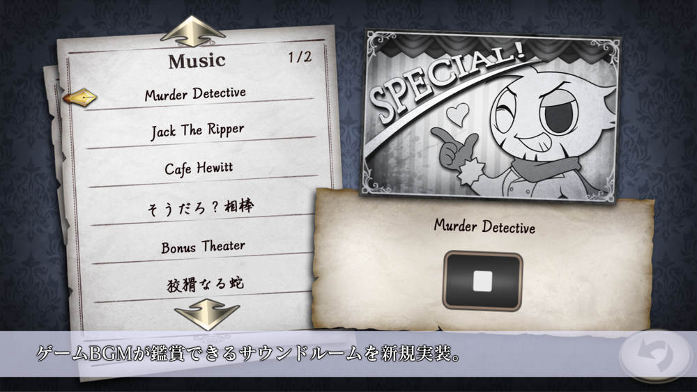 ゲーム内で流れる全BGMが視聴可能なサウンドルームを実装。