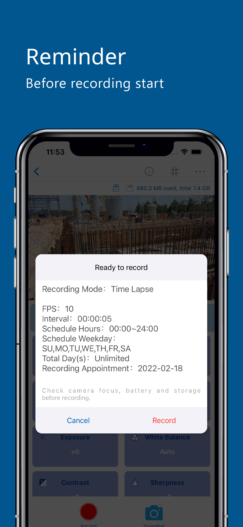 * Setting parameters: FPS, Interval, Quality, Scene, Resolution, Aspect Ratio, Exposure, White balance, Contrast, Sharpness, Saturation, HDR