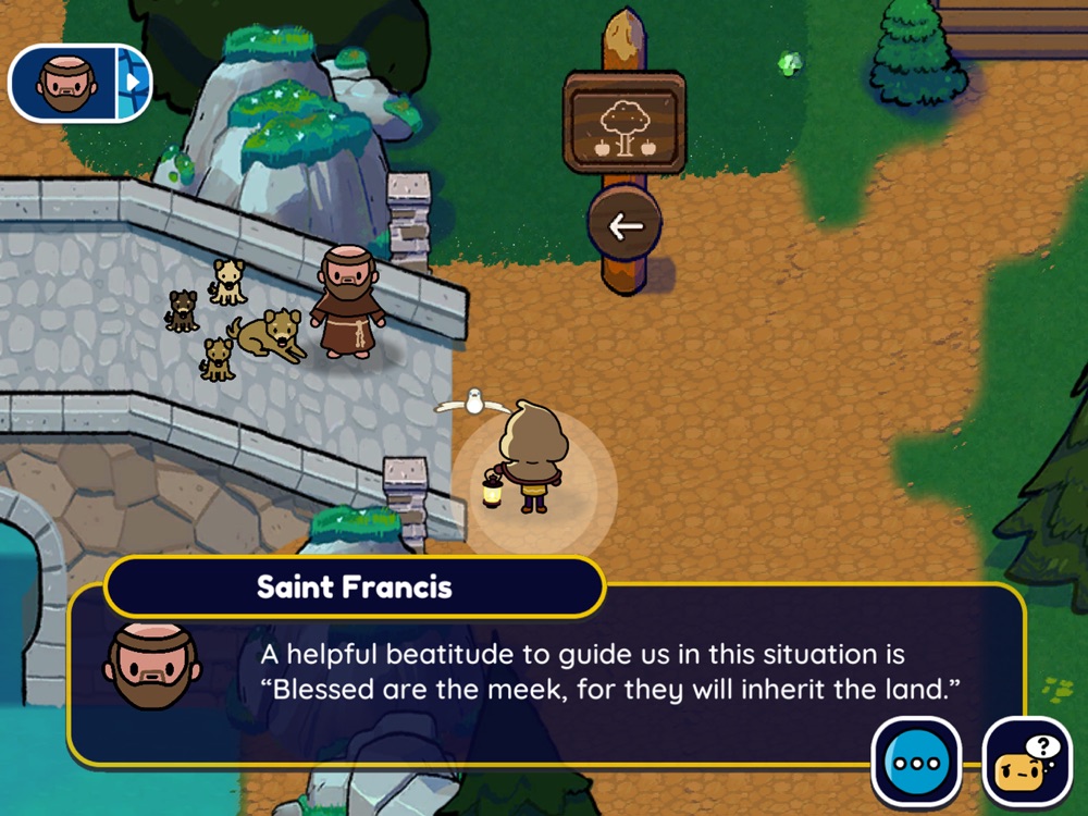 During each quest, the Pilgrim travels through towns and cities that are lively and bustling, full of different characters: people who need help, people who give directions, and people who give guidance—including saints! The Valley, the City, and the Forest each have a Catholic church that provides additional opportunities to learn about the sacraments and sacramentals.