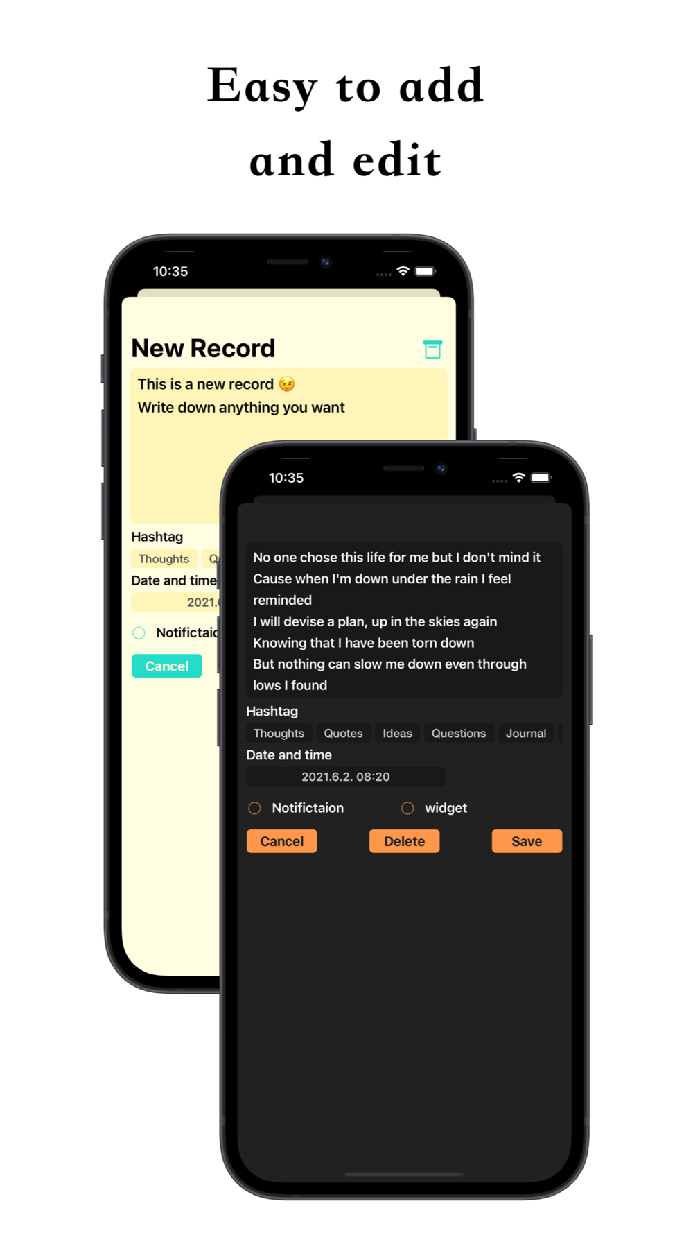 Quick thoughts, inspiring quotes, brilliant ideas, original song lyrics, hilarious jokes, unsolved problems, or personal journal, anything you want to keep in written form can be easily recorded in Today Record.