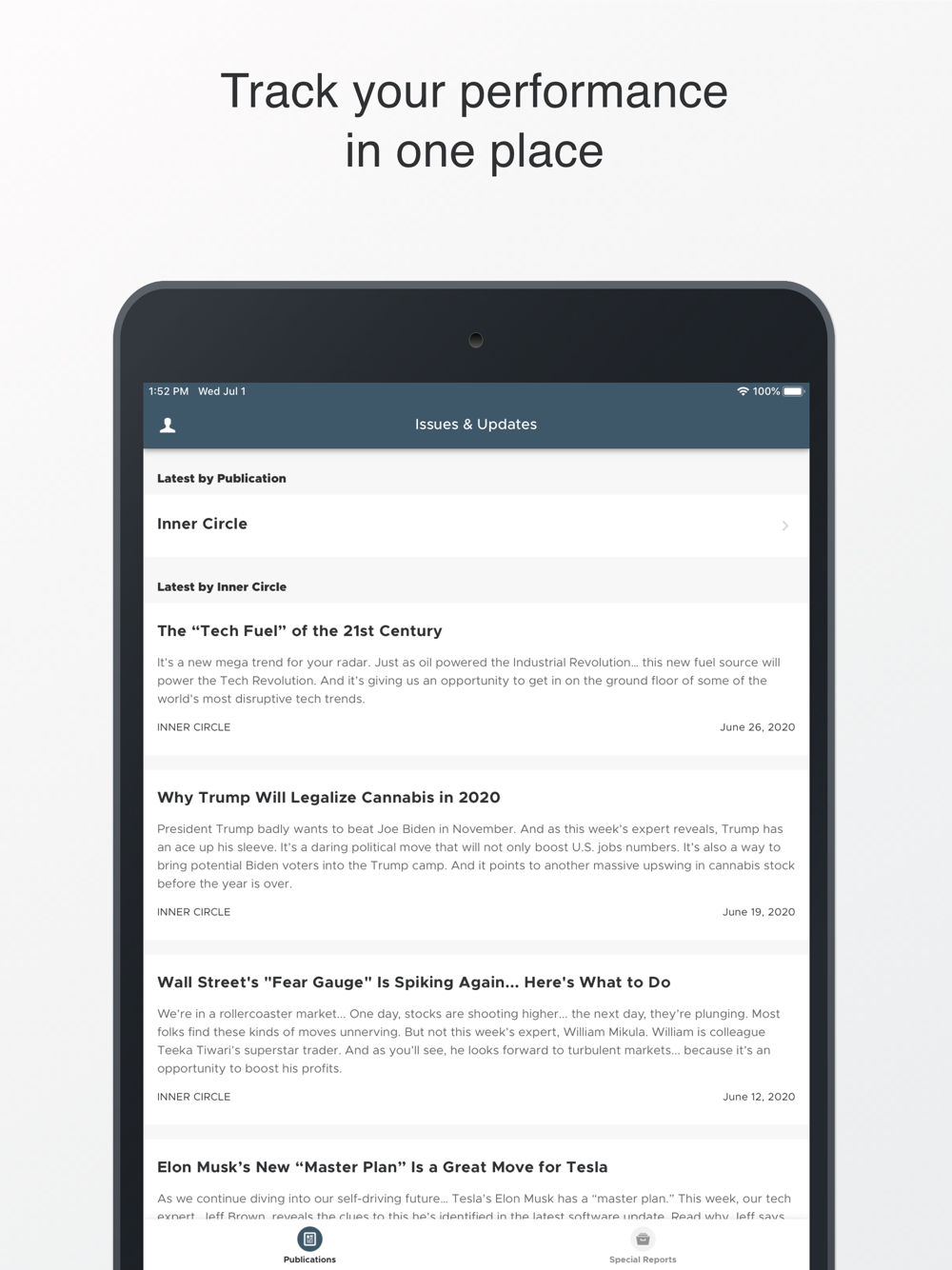 Access all the products you subscribe to, including: The Near FutureReport, Exponential Tech Investor, Early Stage Trader, Blank Check Speculator, and Brownstone Unlimited.