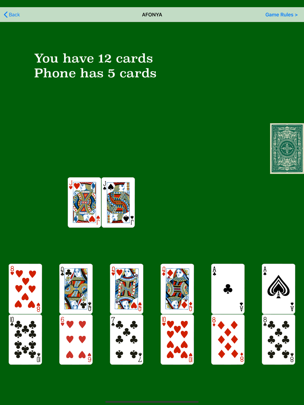 This app hosts six card games in which your task is to get rid of all your cards (if possible). All games are for two players, you and your Phone. The rules of all games are explained. They may be modified by comparison with those known to you.