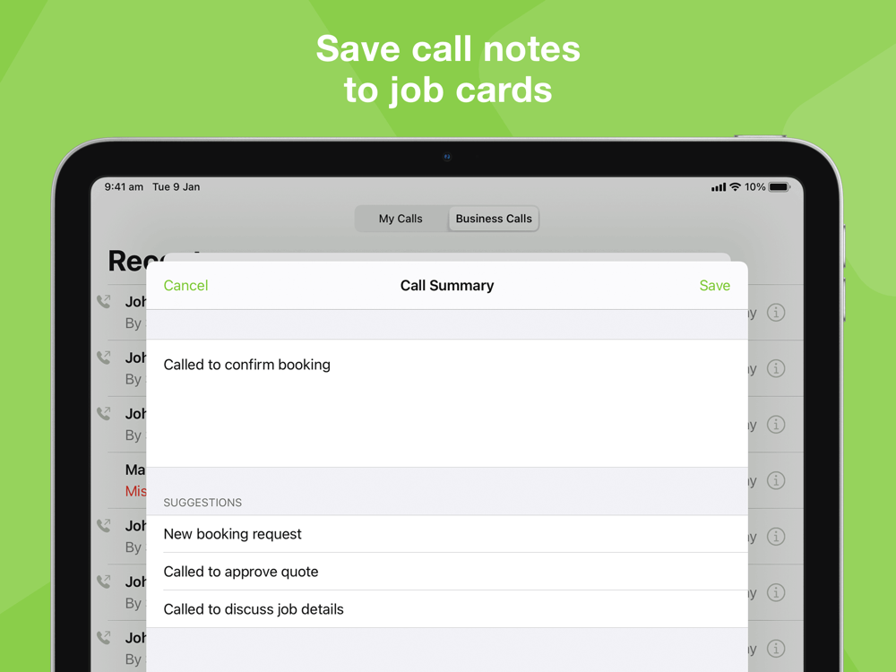 A smarter phone system for trade contractors & services. Take & action client calls efficiently, professionally, anywhere. See which client is calling and their job history. Convert recent calls & voicemails to new jobs. Simplify call diversion after hours. Route business calls to multiple staff, simultaneously. Transfer between staff. Record & transcribe calls, and more.