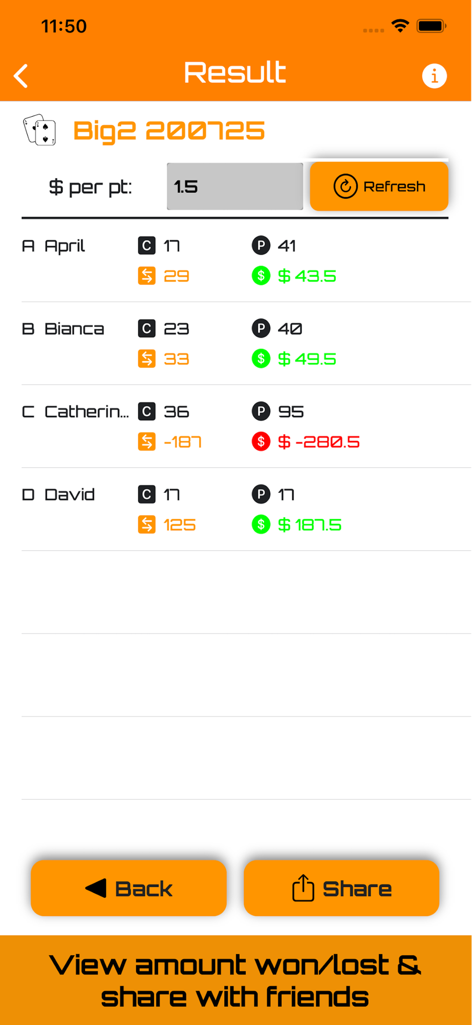 Tired of calculating game points round-by-round? Or lack of change to deal among players for transactions? Here is your solution. You can easily set up game rules and calculate your game points with simple inputs. This app is built in with different module like Big 2 (Deuces), Mahjong, "Fighting Landlord" and "Heaven Nine". This can also apply to all card games and party games with our general calculation module. Also, you may share with your friends on the game results!