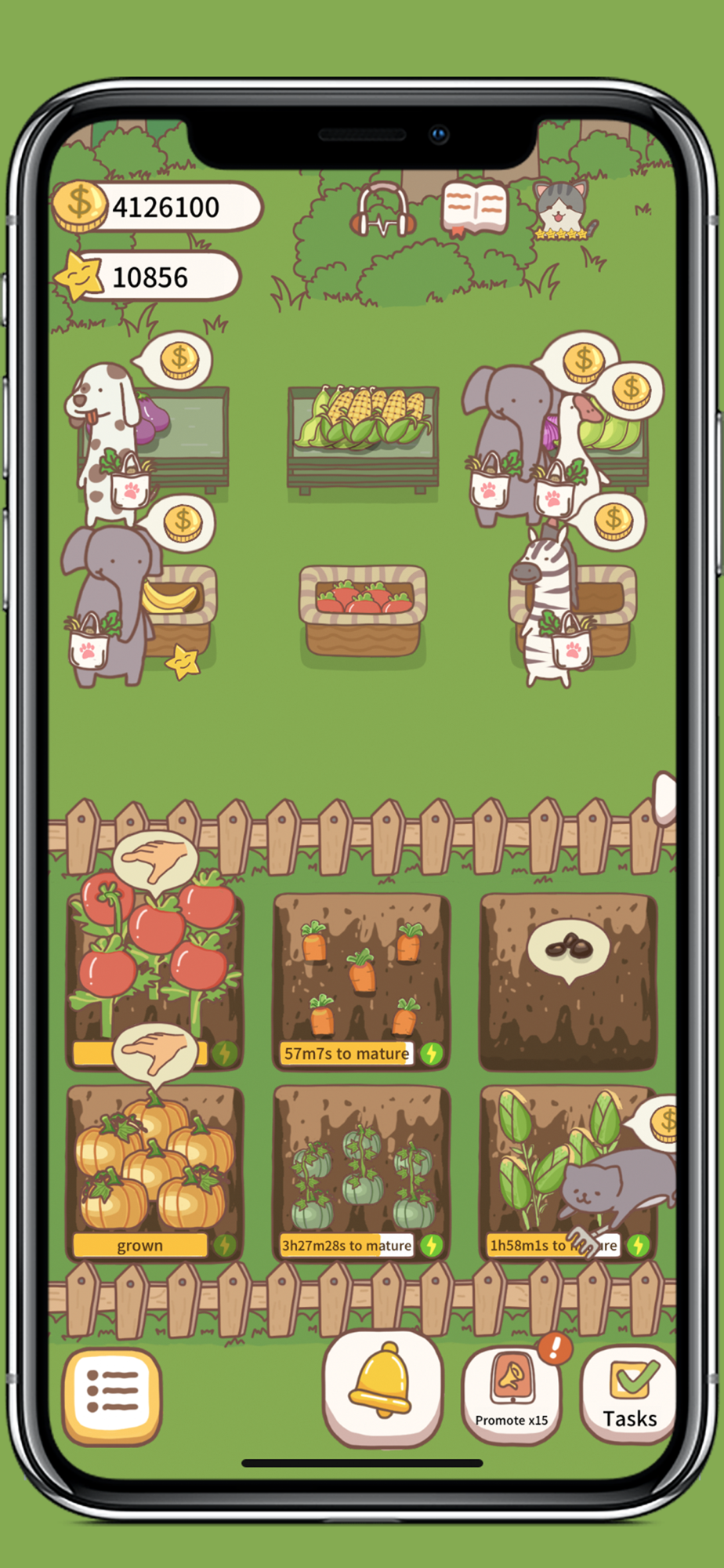 Growing vegetables in vegetable fields, Take care of vegetable growth patiently, Waiting for the vegetables to mature and harvest, Picking vegetables and selling to animals.