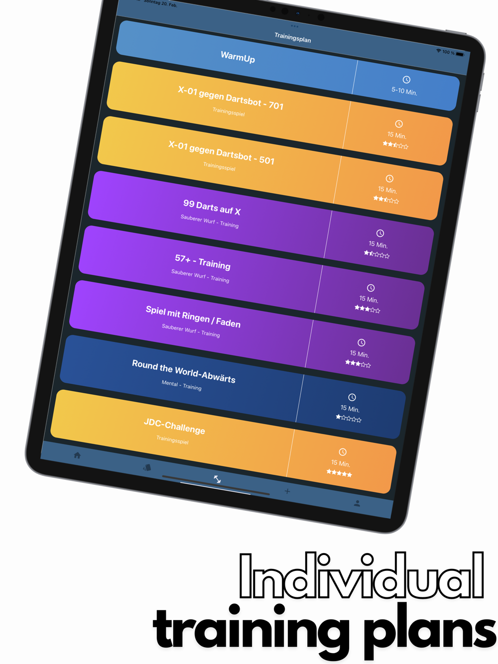 MyDartCoach is an artificial intelligence that creates individual training plans with the help of machine learning and helps you to train properly in order to achieve the greatest possible training progress.