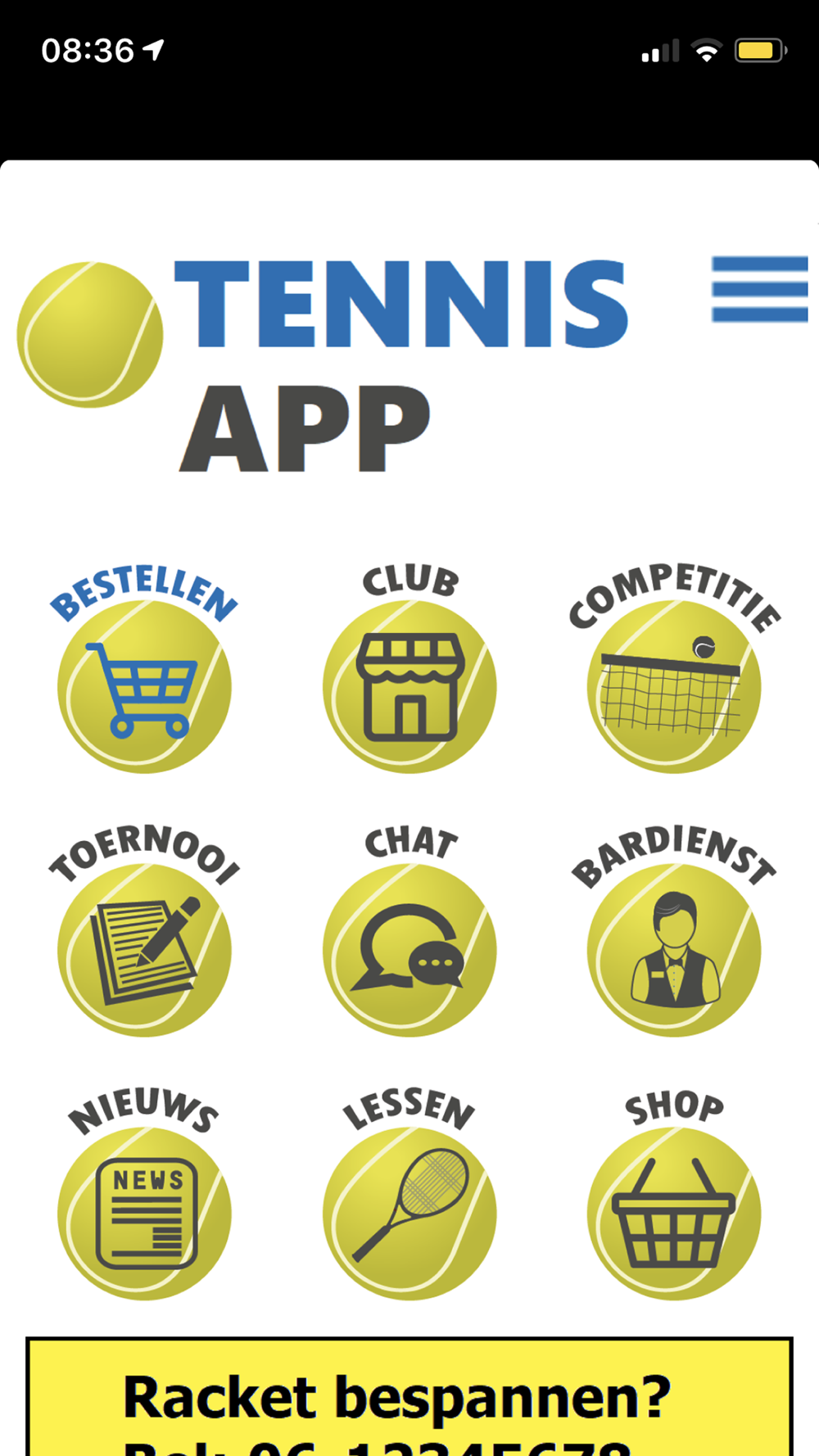 Tennisapp is een app speciaal voor de tennisvereniging. Zo kan je contributie betalen, bardienst aanbieden of uitbesteden, sponsors tonen en naar website/webshop gaan, tennislessen aanbieden of op inschrijven, laatste nieuws tonen, maar ook bestellingen op afstand doen welke naar de kantine wordt verstuurd om af te halen.