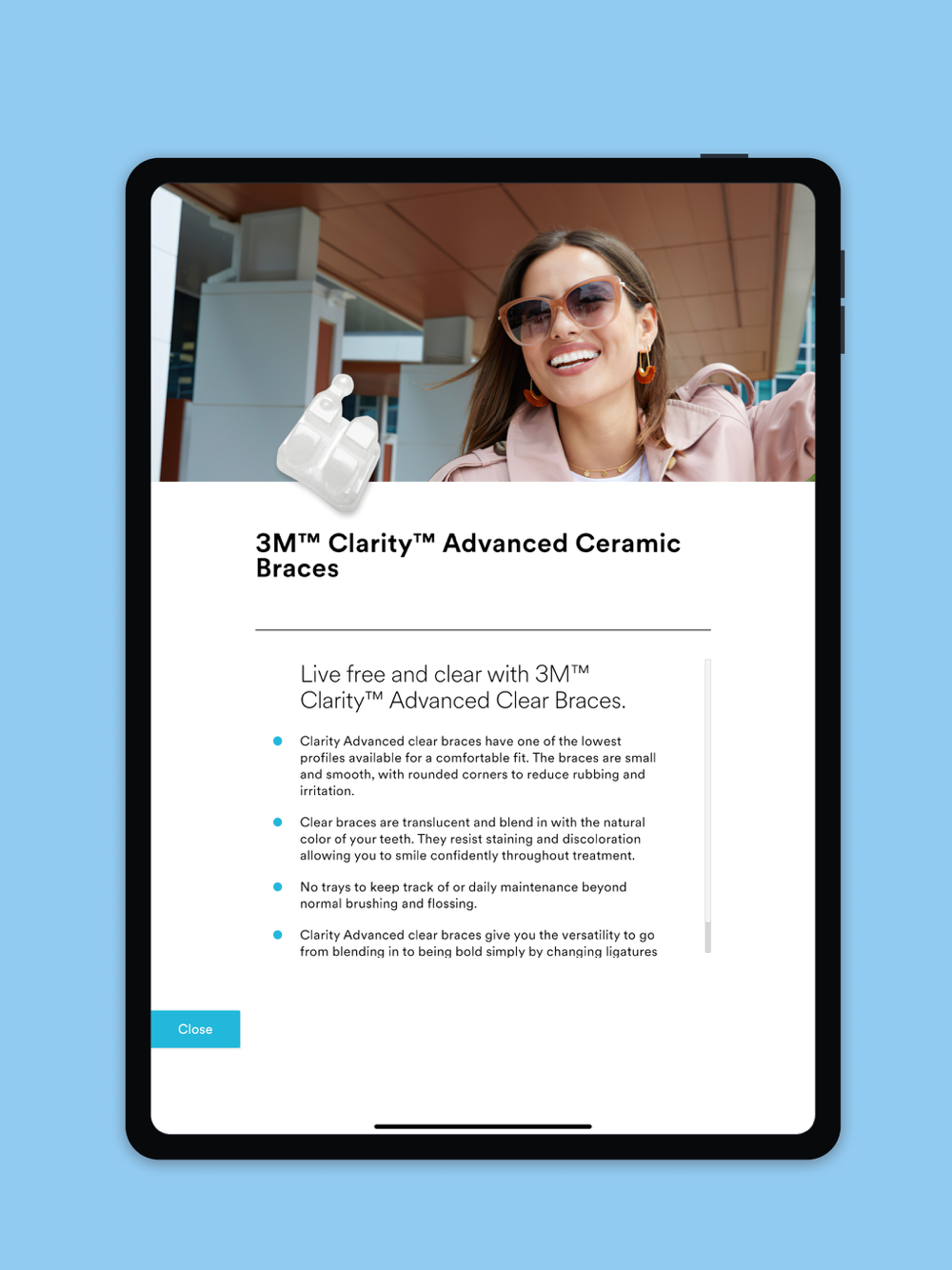 Build excitement for treatment diagnosis with 3M Tx Selector, a powerful app that allows patients to superimpose various 3M orthodontic appliances on a live image of themselves. The app works like a virtual typodont using face tracking technology for a natural and realistic experience. It helps you present treatment options to drive patient acceptance.