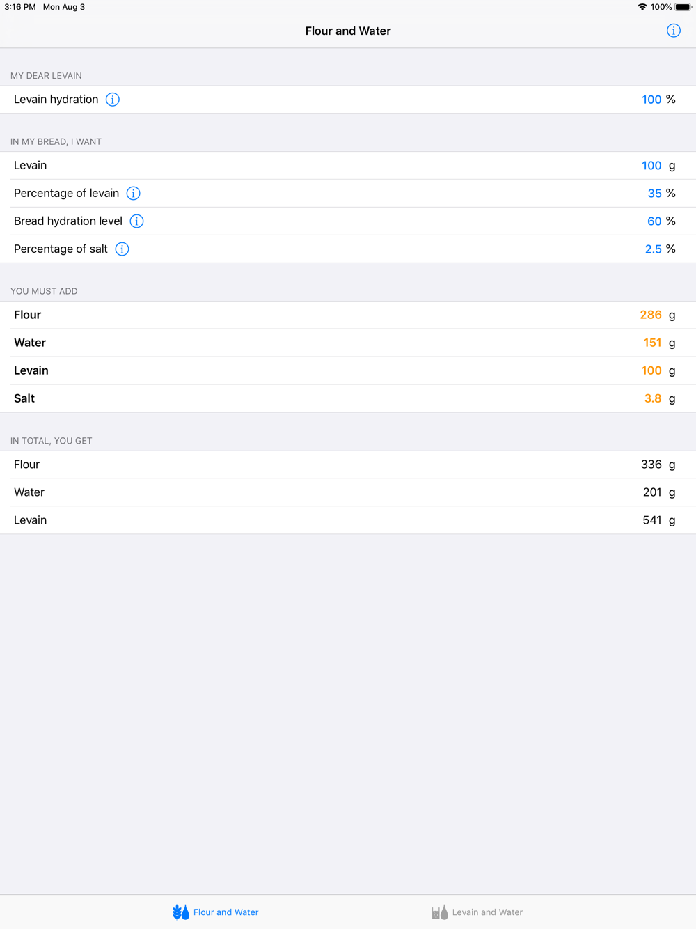 Baking our own bread with sourdough (levain) requires some math. There isn't always a pen a paper in the kitchen and a small mistake can happen so fast. This is the reason why I decided to create this application.