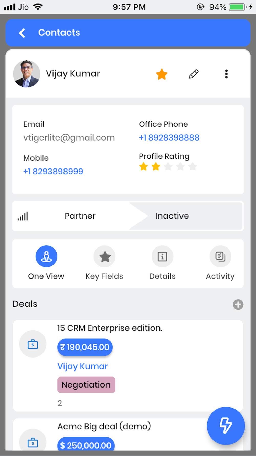 * View Contact or Organization profile scoring on a scale of 1 to 5 stars based on scoring