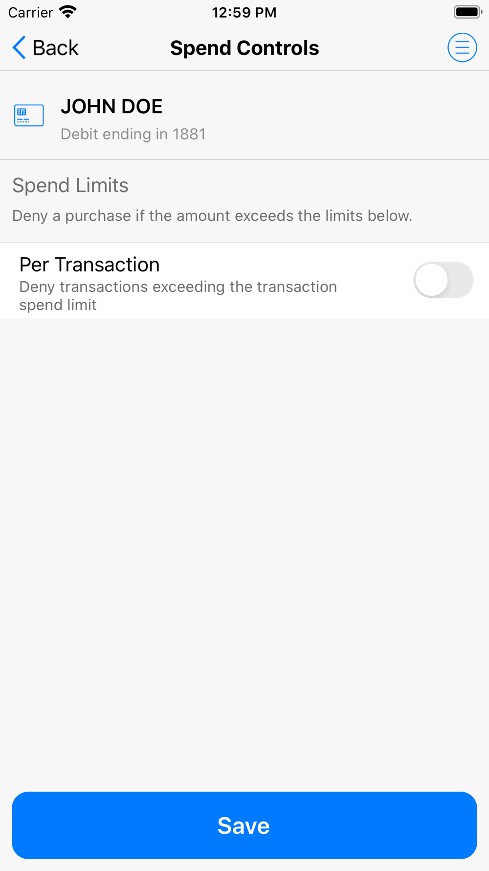 Set spending limits to decline transactions above your thresholds. Monitor activity by category such as gas stations and restaurants, and by type: in-store purchases, e-commerce transactions and ATM transactions.