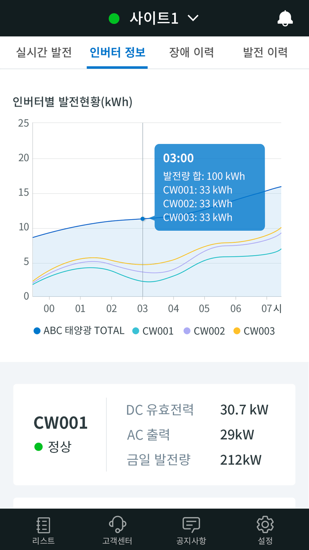 인업스 PVMS는 사용자가 모바일 앱을 통해 실시간 발전량, 인버터 정보, 발전 이력, 장애 이력 그리고 발전 리포트를 확인하여 태양광 발전소의 운전 이력을 분석하는 데 도움을 줍니다.