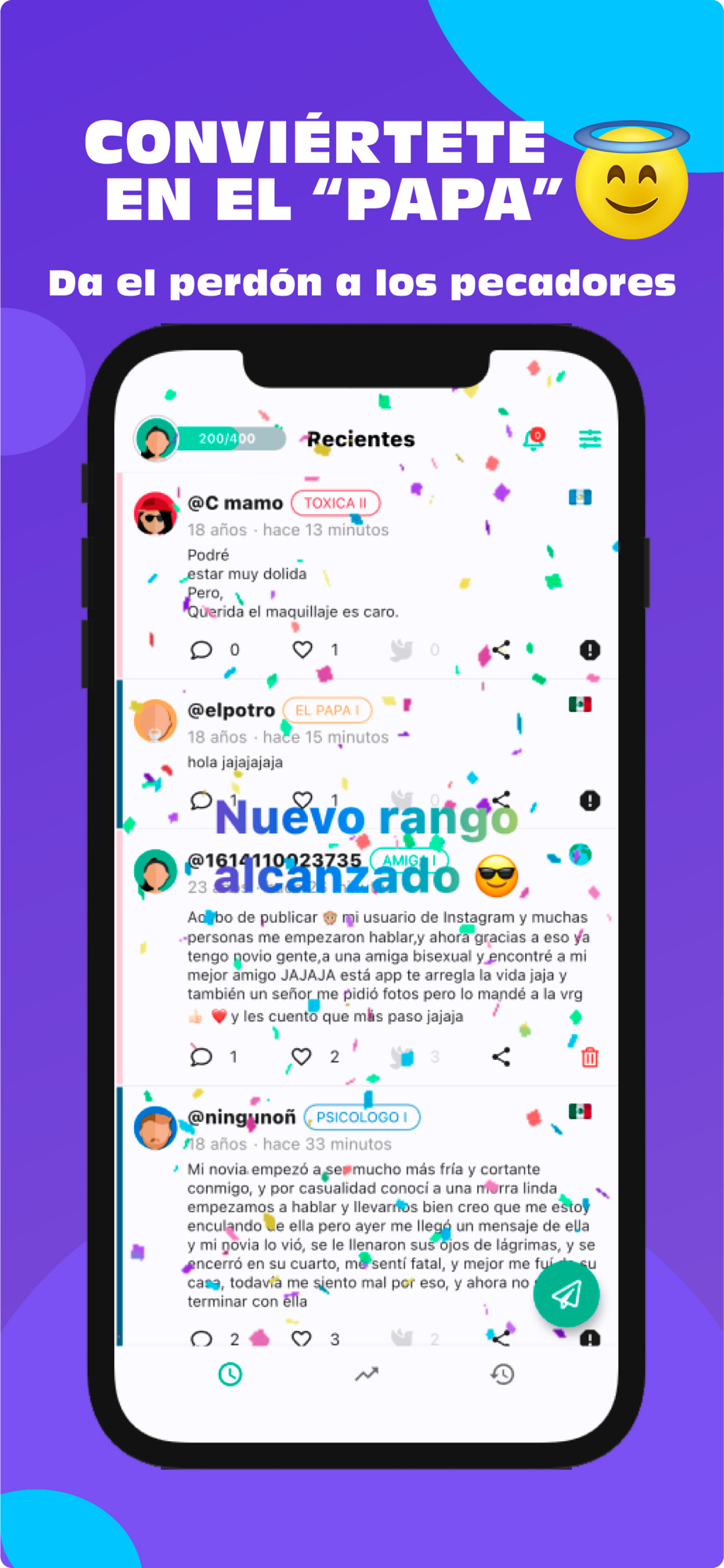 Si tienes un problema y necesitas de ayuda profesional nosotros contamos con personas de rango “psicólogo” o “Papa”que son personas especializadas con consejos totalmente profesionales que podrían ser tus amigos y consejeros personales. Tú puedes llegar a ser uno de ellos. Descárgalo y pruébalo ahora.