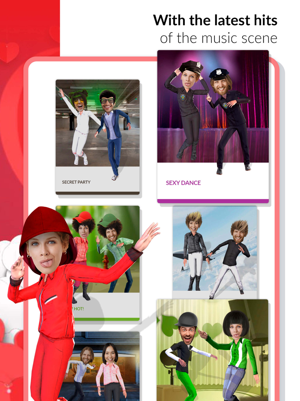 Create content for such holidays as Christmas, New Year, Valentine’s Day, Halloween, Thanksgiving and more – and this is not even a full list. Pick up a template that matches your occasion and upload your face. This free dancing app provides a diversity of choices considering templates.
