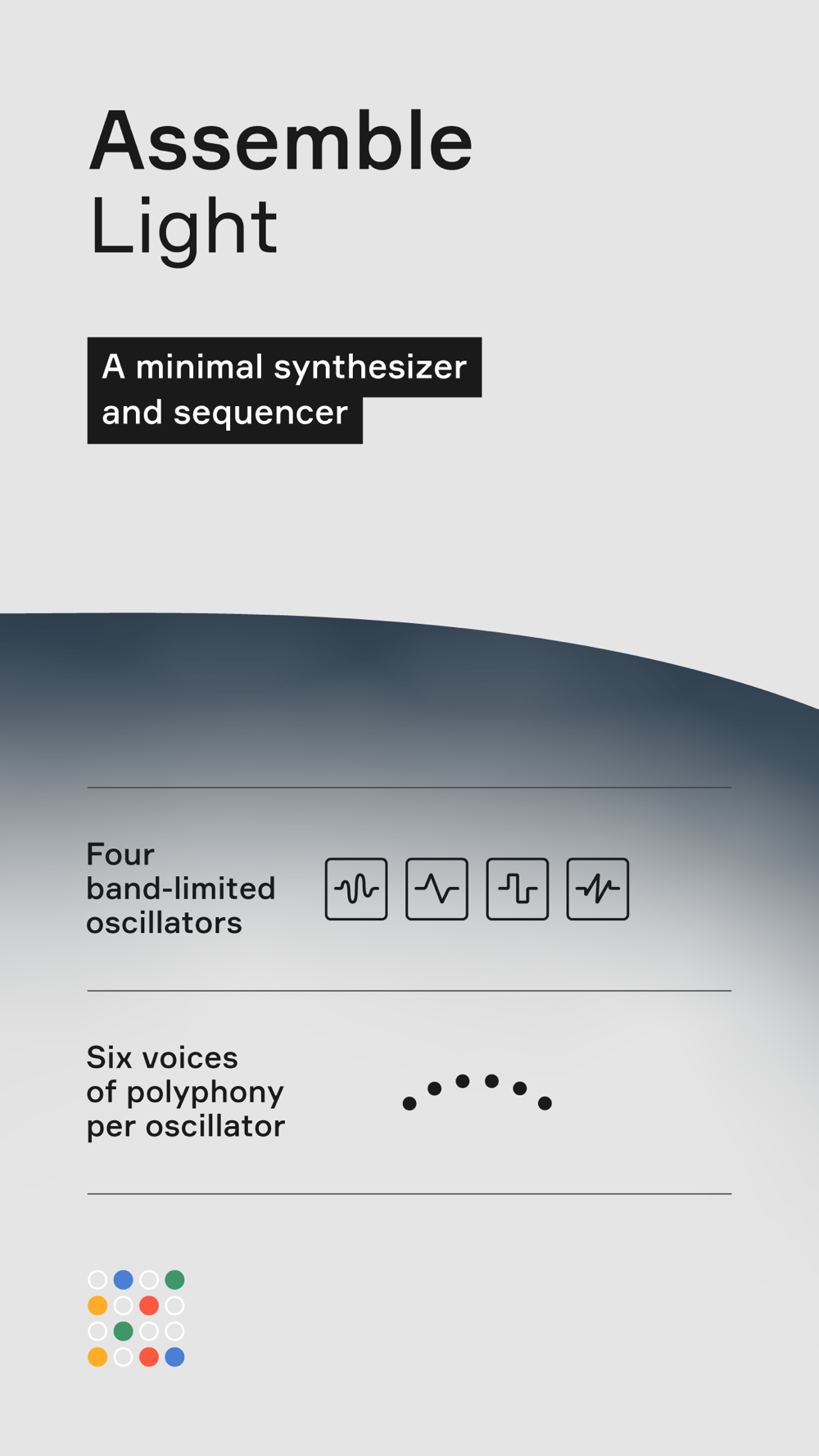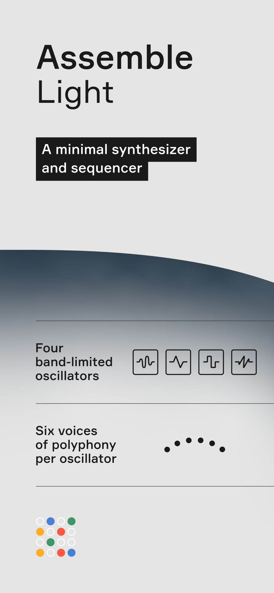 Assemble Light utilises the same synthesizer engine as Assemble for iPad. It features four bandlimited oscillators with six voices of polyphony each, a lowpass filter, an oversampled, tempo-synchronized stereo delay effect, and a vibrato effect. The synthesizer's parameters can be modified in real-time from the options menu.