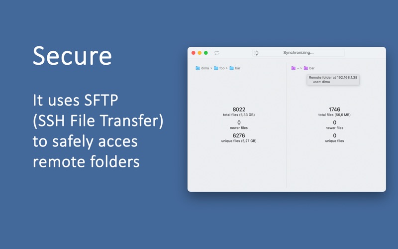 Keep your files up-to-date at all of your locations with this easy-to-use utility. It can synchronize and backup/restore your files - both in local filesystem and on remote hosts. Remote folders are accessed via SFTP (SSH File Transfer).