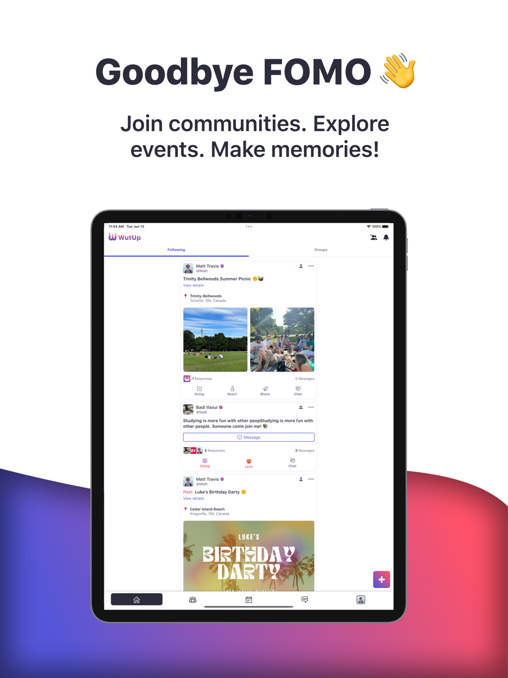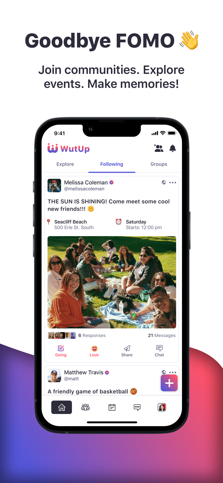 GROUP MESSAGING: Engage in real-time conversations through two types of group chats: Post-Based Chats, which are automatically generated for each new post and allow you to discuss details, and plans, or socialize with others that are going; and Community Chats, which are created when you join or establish a community and are ideal for ongoing discussions and activity planning.