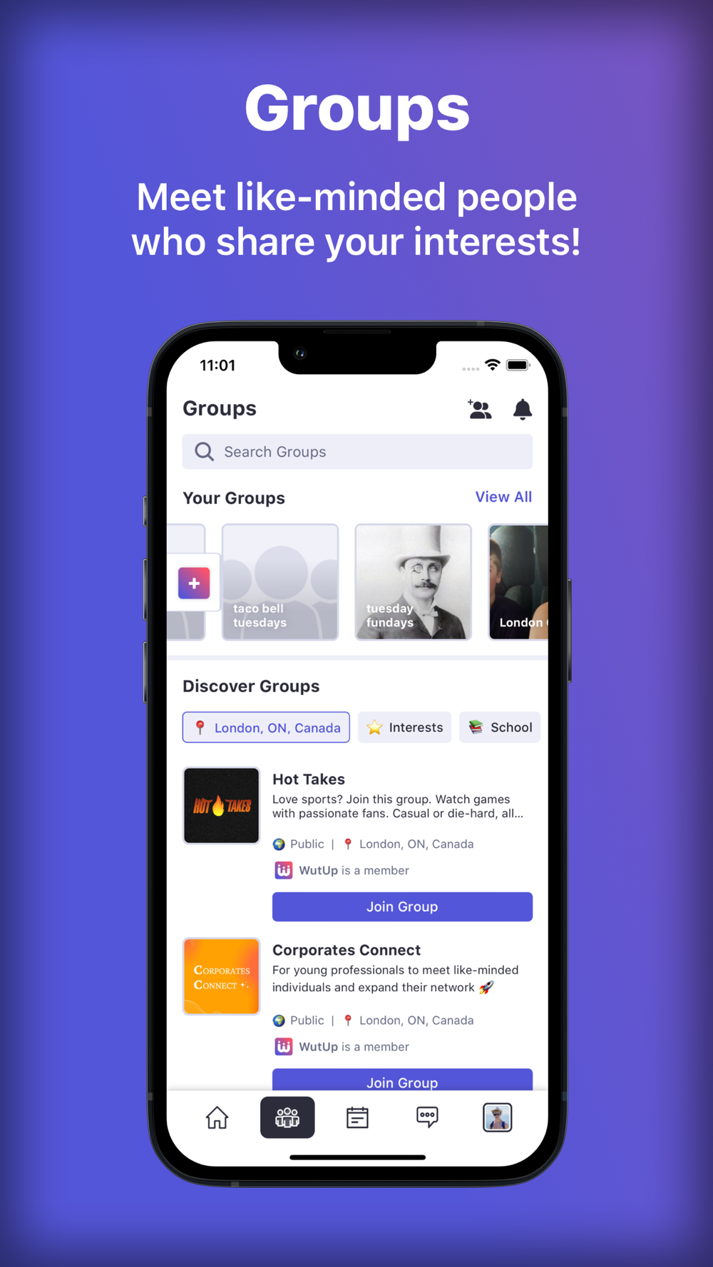 COMMUNITIES: A space to find and join communities of like-minded individuals. Whether you're into hiking, partying, gaming, or cooking, you can find a group that shares your passion. You can also create your own group, inviting others to join and share in your interests. It's all about bringing people together and fostering a sense of community.