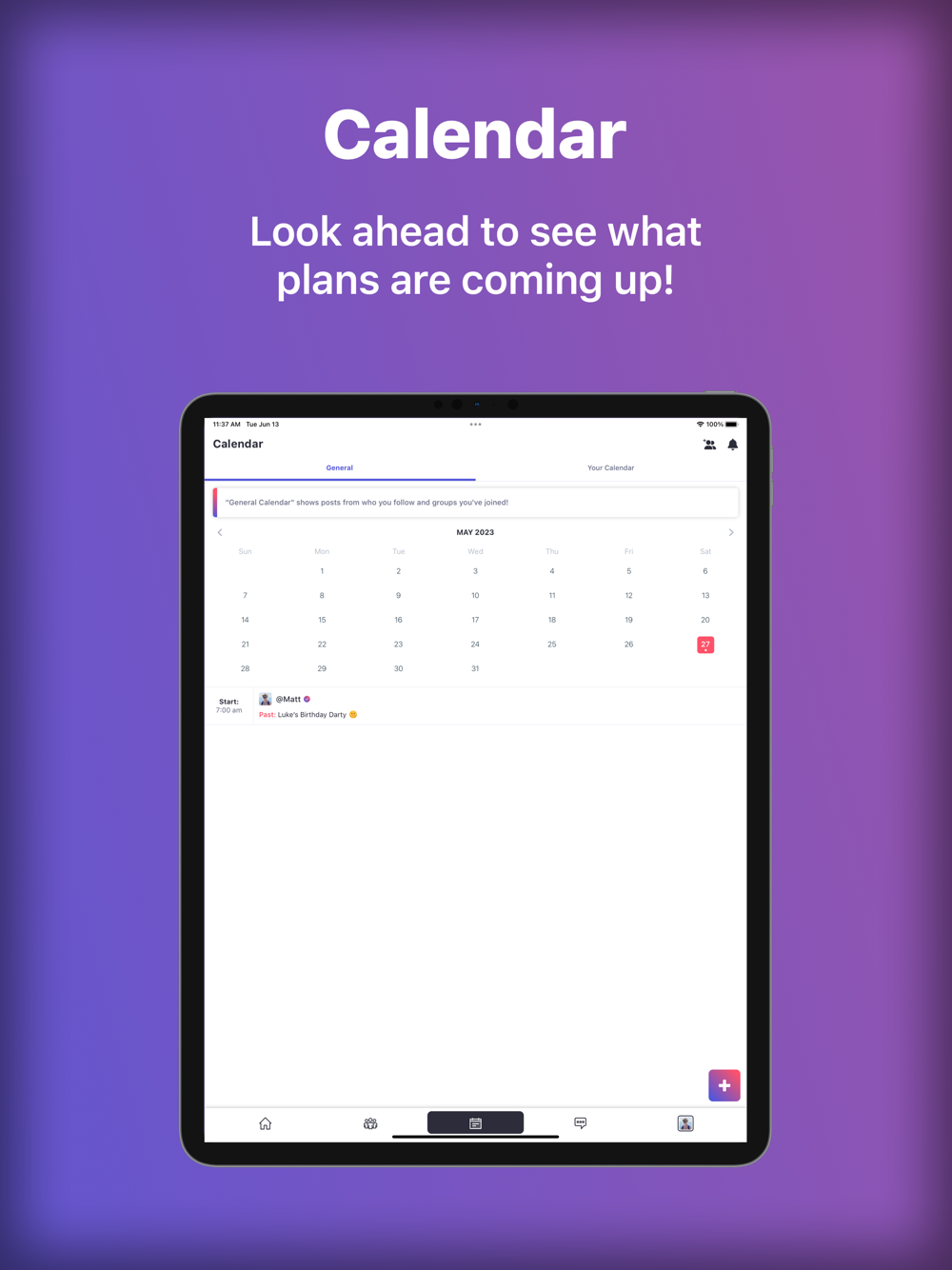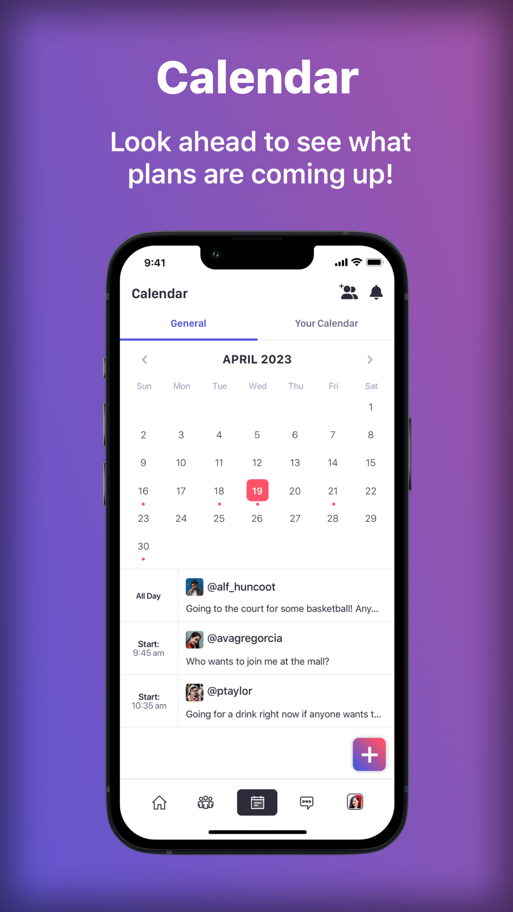 CALENDAR: The calendar feature helps you plan ahead. The general calendar gives you a sneak peek at the upcoming posts from people you follow. Your personal calendar displays the events you've reacted to or marked as 'going' to, giving you a heads-up on the activities you've shown interest in.