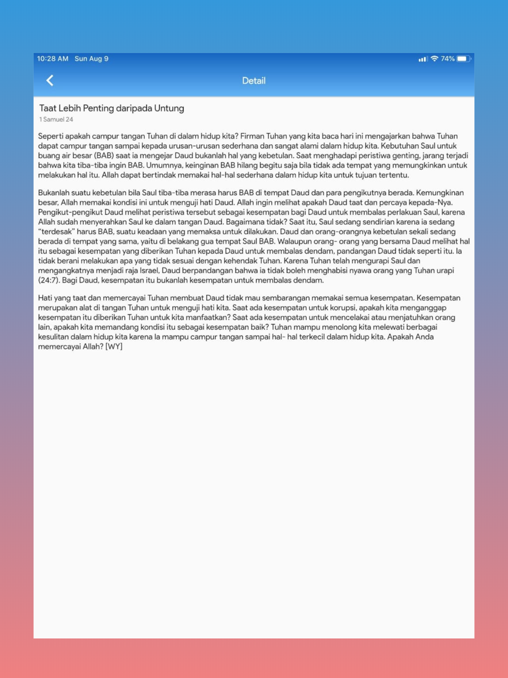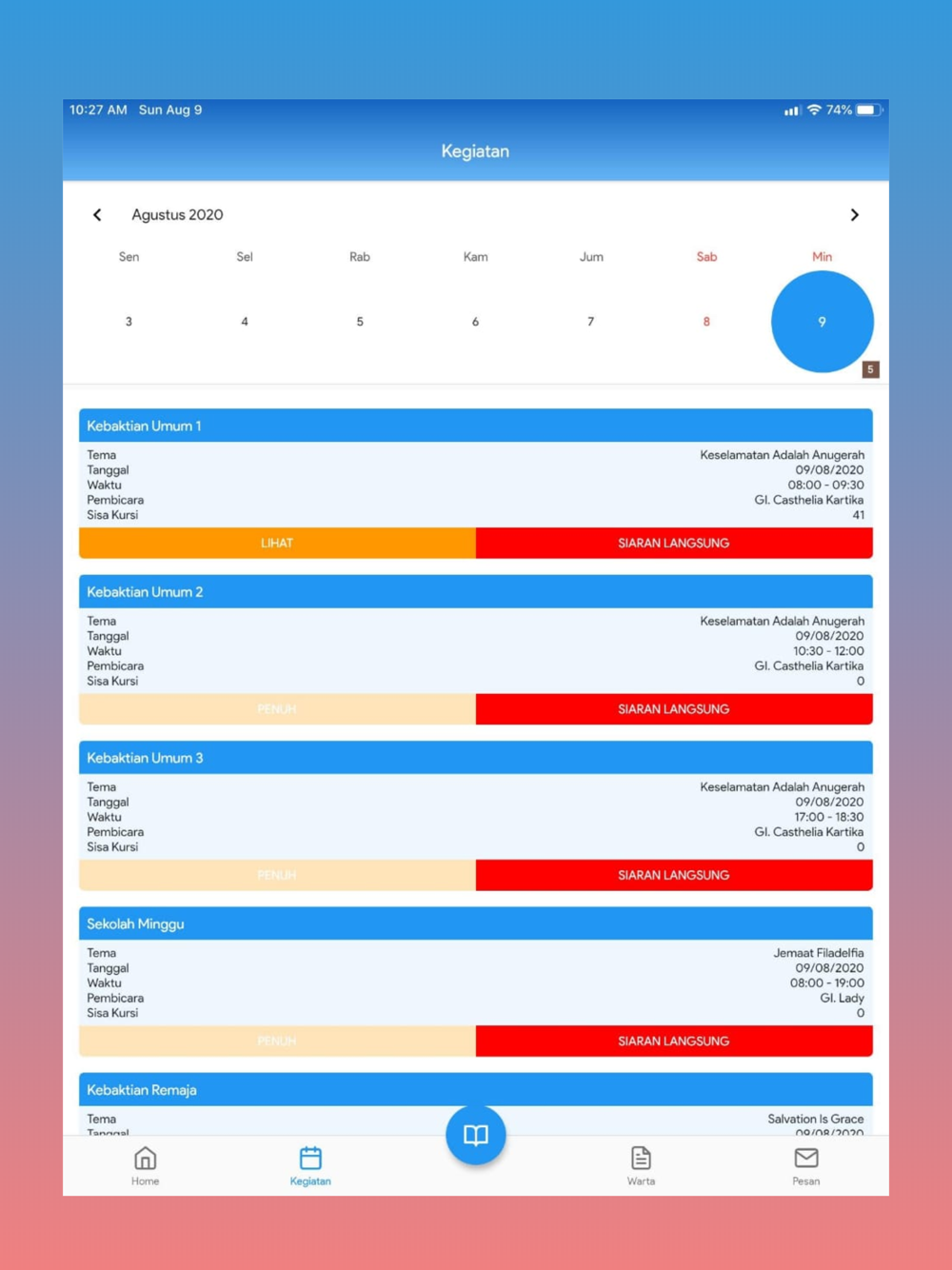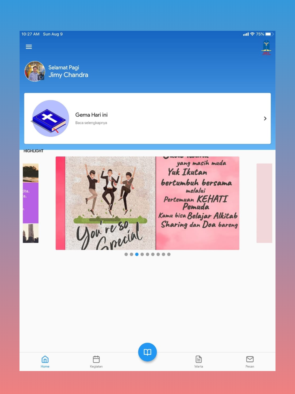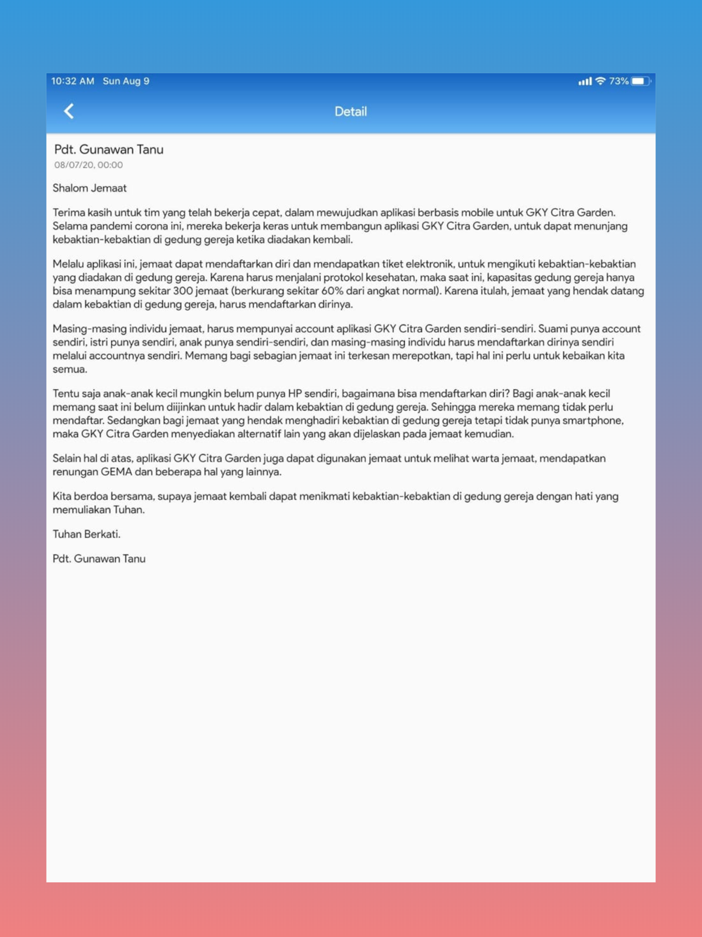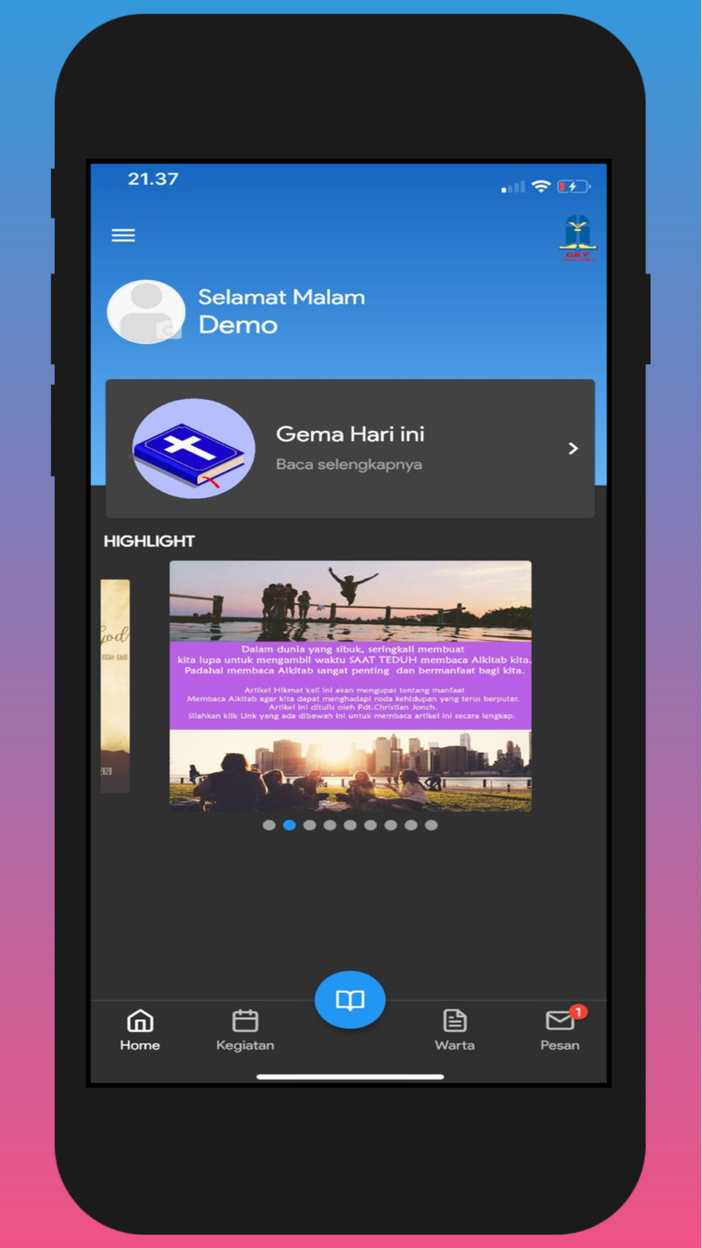 SHALOM JEMAAT!!Aplikasi GKY Citra Garden kini hadir dengan tampilan baru yang akan lebih memudahkan bagi jemaat dalam menggunakannya sehari-hari.Apa saja yang baru di GKY Citra Garden app?1. Menu Navigasi TengahMenu pilihan yang berada pada bagian tengah layar, guna mengakses fitur:• Renungan • Alkitab• Literatur• Scan QR2. Menu Navigasi BawahMemudahkan Anda untuk dapat mengakses fitur:• Agendaku• Kegiatan• Warta• Pesan3. BerandaHalaman utama aplikasi, menyajikan informasi kegiatan GKY Citra Garden terkini, Nats Harian, tombol shortcut untuk menghubungi Gereja melalui WA, dan Dari Kita Untuk Kita.4. Kartu AnggotaJika Anda telah resmi menjadi anggota GKY Citra Garden, maka Anda akan dapat melihat kartu keanggotaan pada halaman ini.