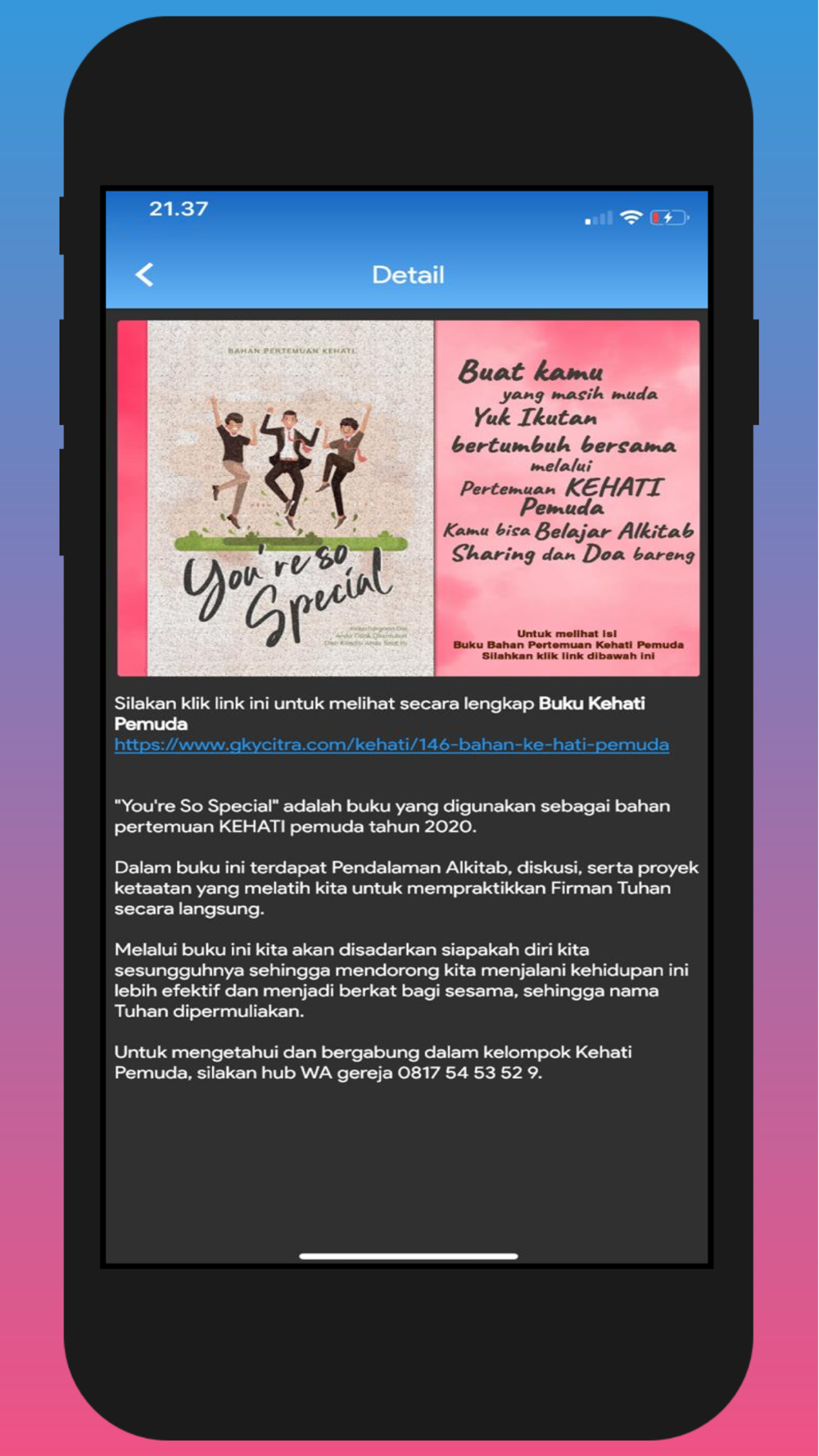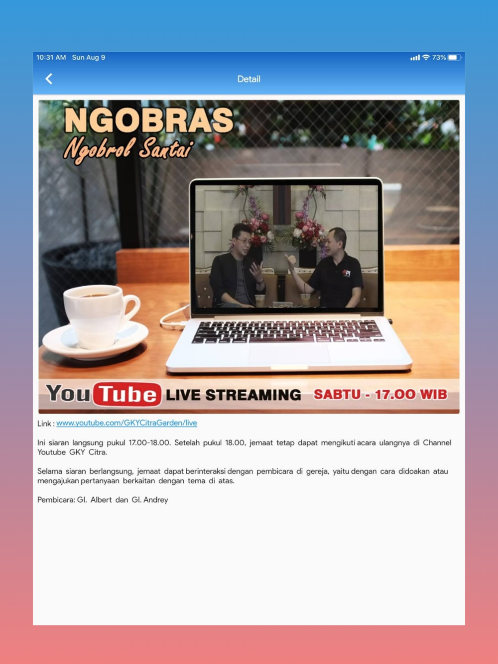 Aplikasi GKY CITRA GARDEN adalah aplikasi resmi milik GEREJA KRISTUS YESUS (GKY) CITRA GARDEN (GKY), yang bertujuan untuk memberikan informasi kepada seluruh masyarakat, terkhususnya jemaat GEREJA KRISTUS YESUS CITRA GARDEN.