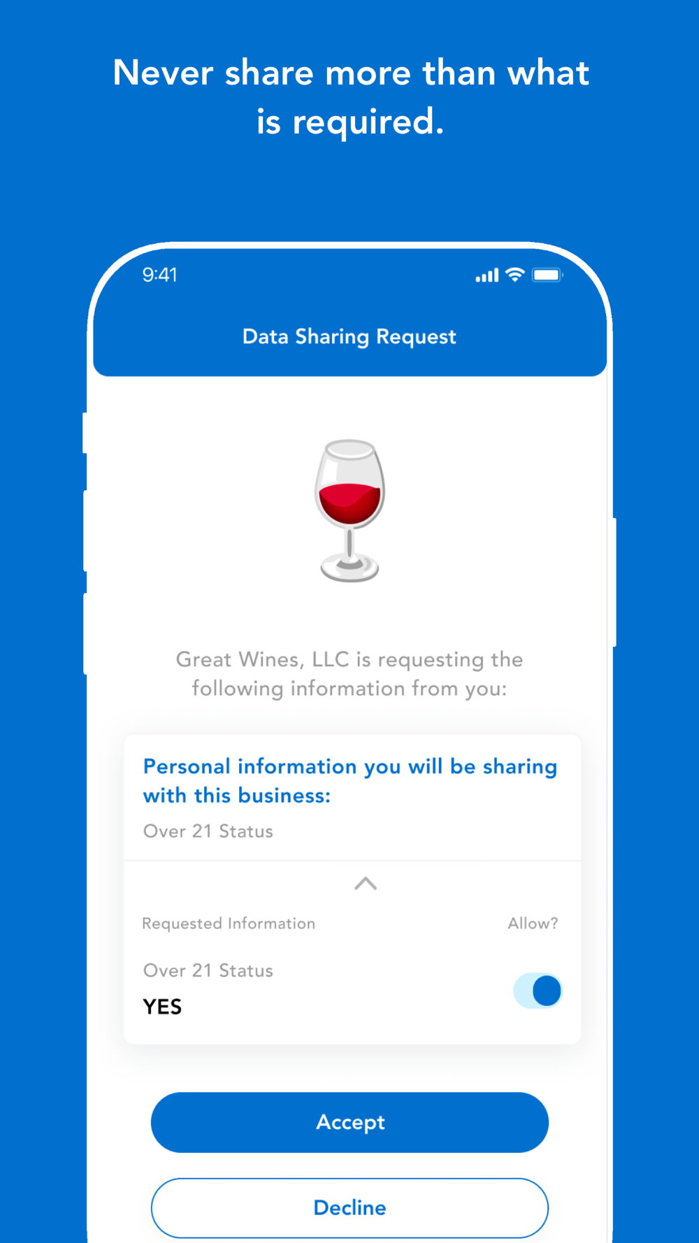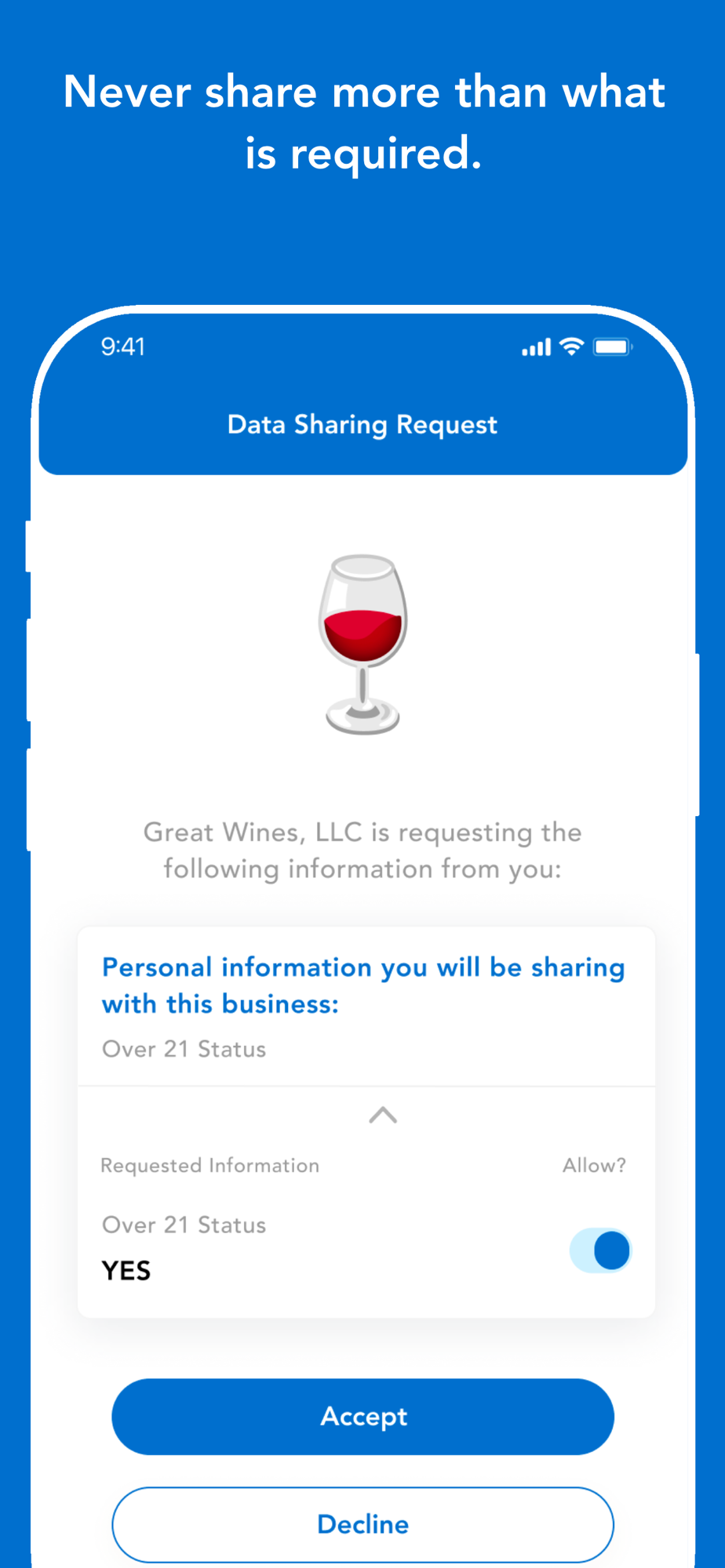 Age Verification – Anonymous identity proofing for any age restricted product both online and in person covering alcohol, tobacco, CBD, Adult content, etc.