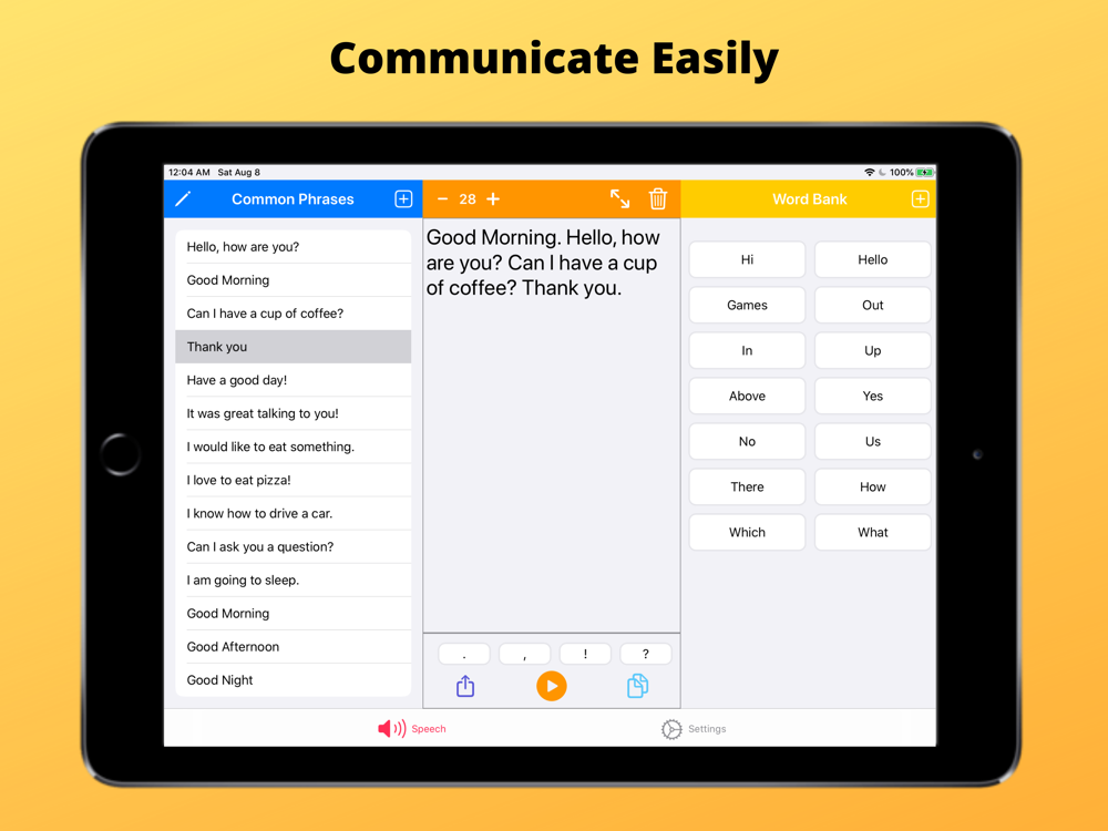 The app makes it extremely easy to communicate with other people, and provides access to fully customizable phrases and words to reduce typing effort. Speechability provides a fun and easy-to-learn layout, and offers a wide variety of features, with more being added all the time to ensure the best experience for all our users.