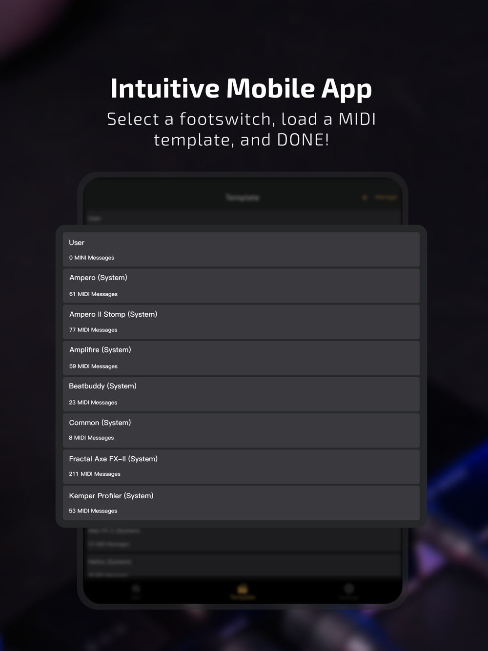 In the app we offer you several templates for you to achieve essential/advanced controlling of your musical gear: Select a footswitch, load a template and you’re ready to change presets, turn on/off effects, etc. You can also save your own templates and write notes on them.