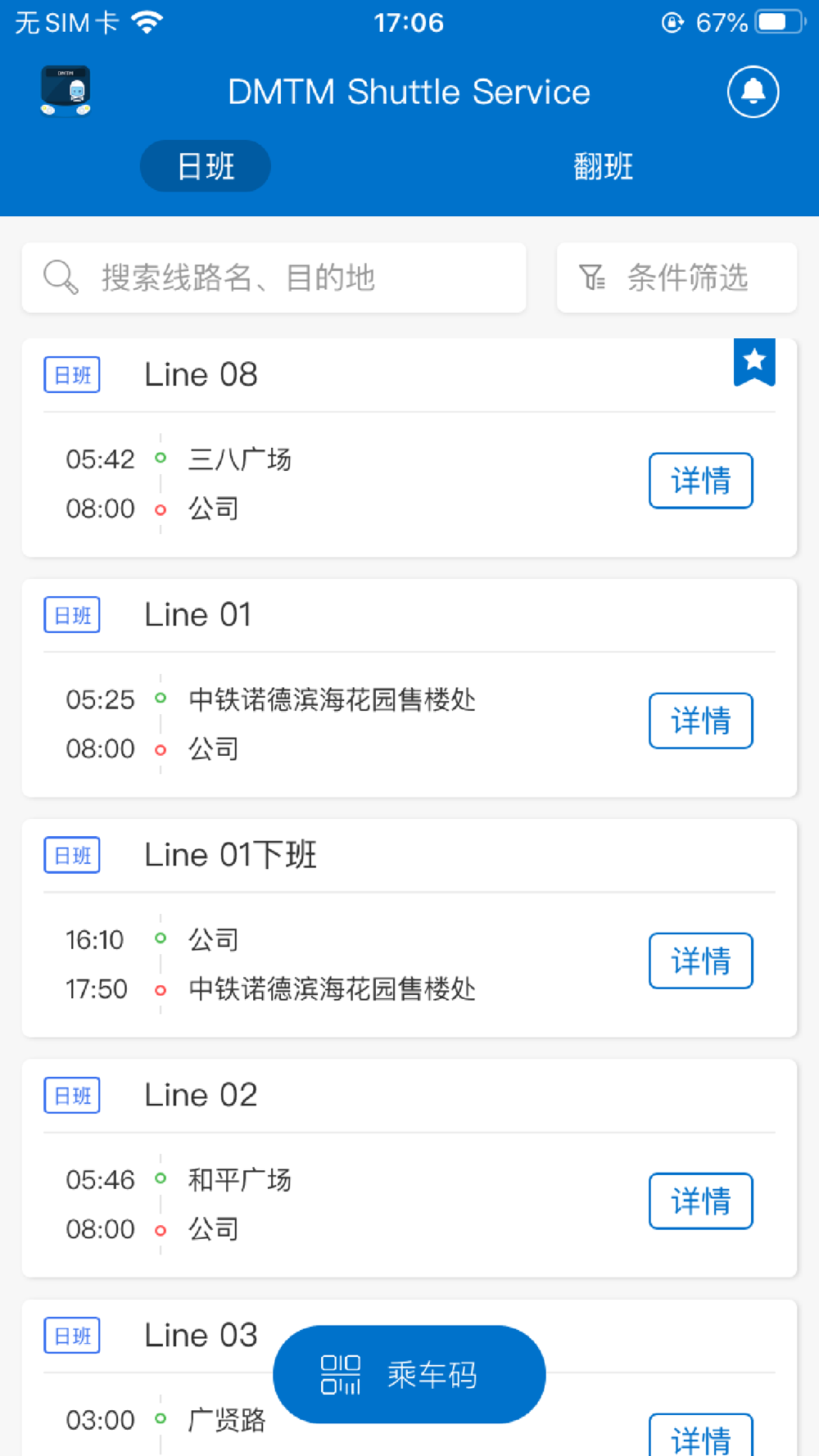 “ DMTM Shuttle Bus"是一款理念领先的智慧班车产品。用户可以通过App快速的查找到想要乘坐的班车线路,并能全面了解线路的详细信息。用户可在页面上查询到班车车辆运行的实时位置,节省在外等候班车的时间,让用户不再错过班车。能够根据实际情况切换乘车权限,并查看个人乘车记录。同时,用户也可以查询到每条班线中各站点的位置及图片,可跟随内置导航准确的到达班车乘降站。