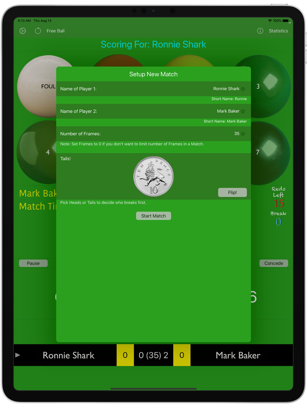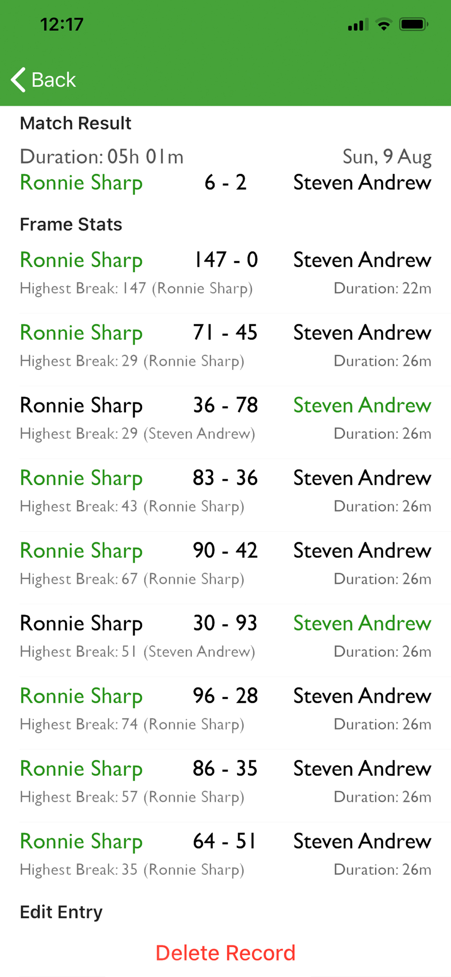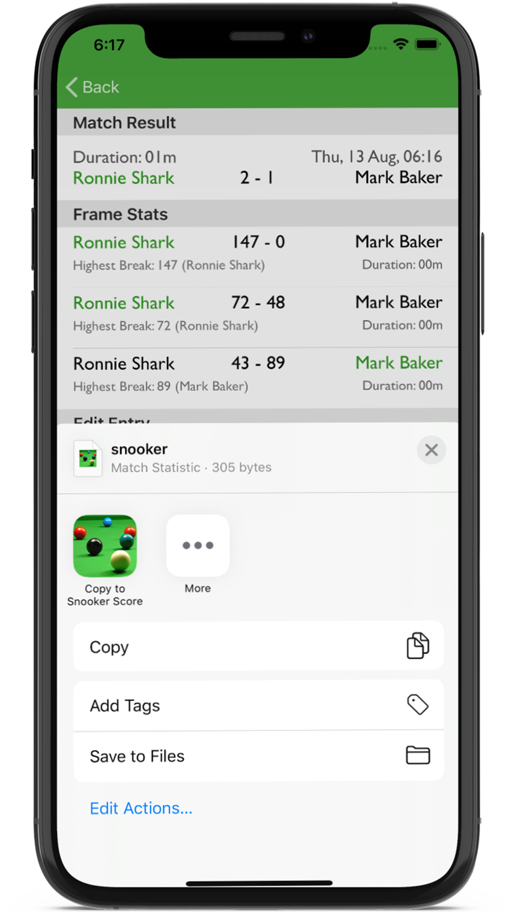 Every Match Result is saved and can be viewed in details which show time, score, highest break and duration of each frame in a Match. Match Results can be shared via Airdrop or other Convenient way with your friends who also use this App.