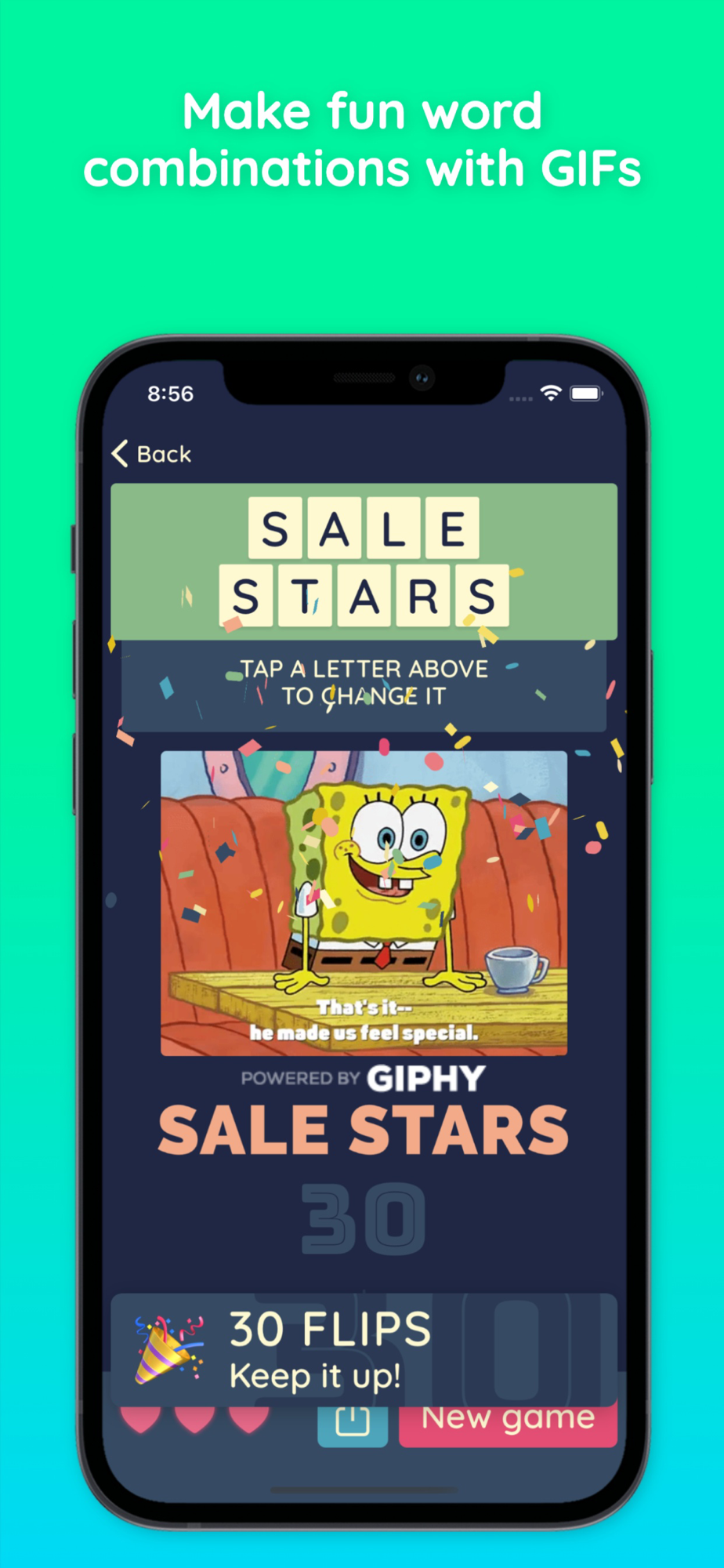 It's a new take on word ladder games where you can make some funny word combinations! Get related animated GIFs with every word you submit - a great way to remind you of your favourite TV show like Shitt's Creek or Breaking Bad, or a classic like Friends, The Simpsons or The Big Bang Theory! Or just get a great meme that you can share to Instagram, Snapchat or Twitter.