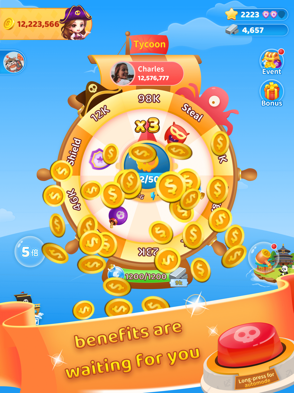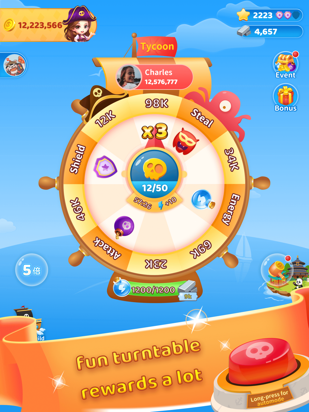 Yo ho! For those who’re brave enough to spin the magical wheel, you shall be rewarded with treasures — coins, energy points, building materials, and magical items! Use them to build new islands and upgrade the building on them. The higher your island level, the more rewards you’ll get!