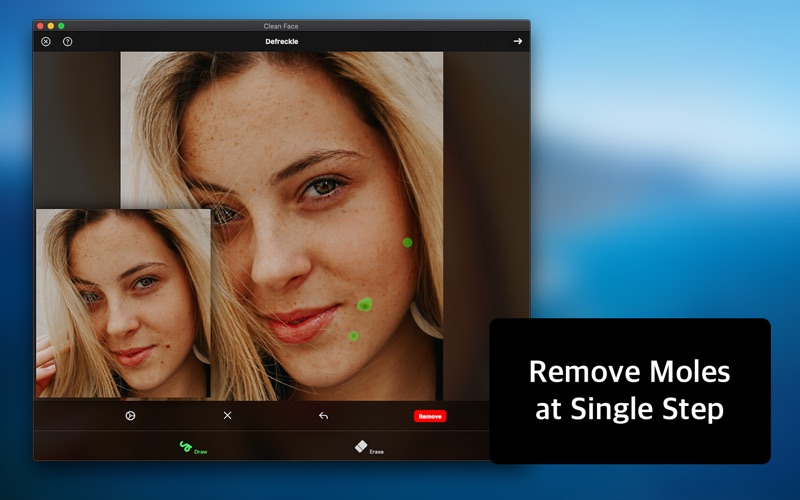 You can remove freckles, moles and wrinkles just by tapping or drawing lines on them. You can also smoothen your skin at just single step.