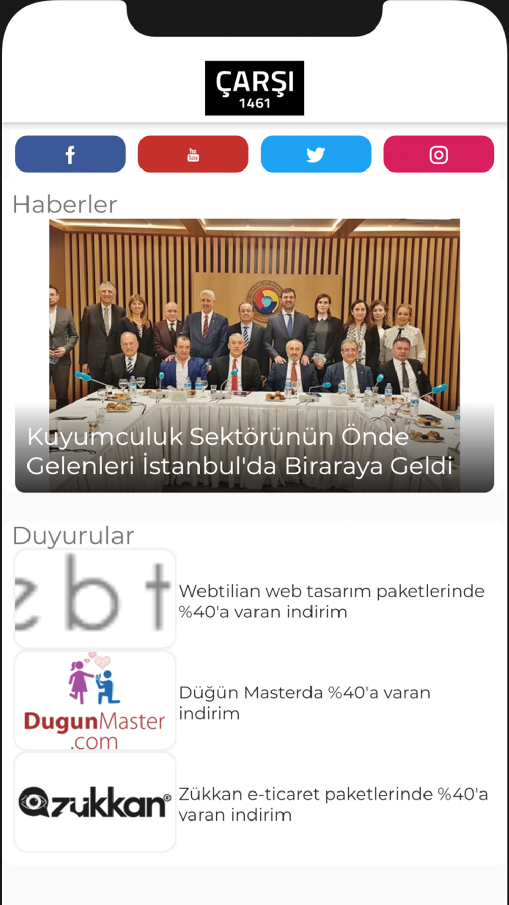 Yine kuyumculara özel fırsatlar özel indirimlerle Çarşı1461 tarafından sağlanacak. Kuyumcuların özel indirimlerle faydalanacağı fırsatlar içerisinde restoran, sağlık, otomotiv, turizm, otel, sigorta, inşaat, eğitim, organizasyon gibi birçok sektör olacak. Bunların yanı sıra sitemiz kullanıcılarına özel lokasyon ve kampanya bildirim hizmetleri, toplu SMS, mailing (toplu mail gönderme) talep eden firmalarımıza sunulacak.