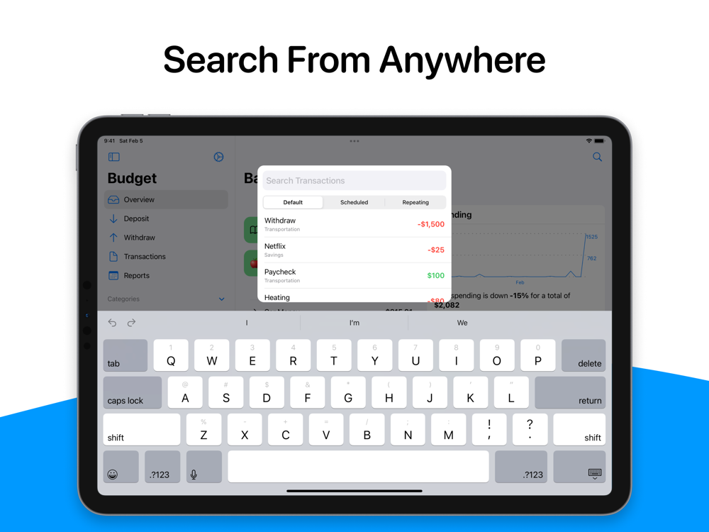 Can’t remember when you bought coffee last? OpenBudget’s transaction search can help you out! Search all of your past transactions instantly and get a list of your transactions right on your device.