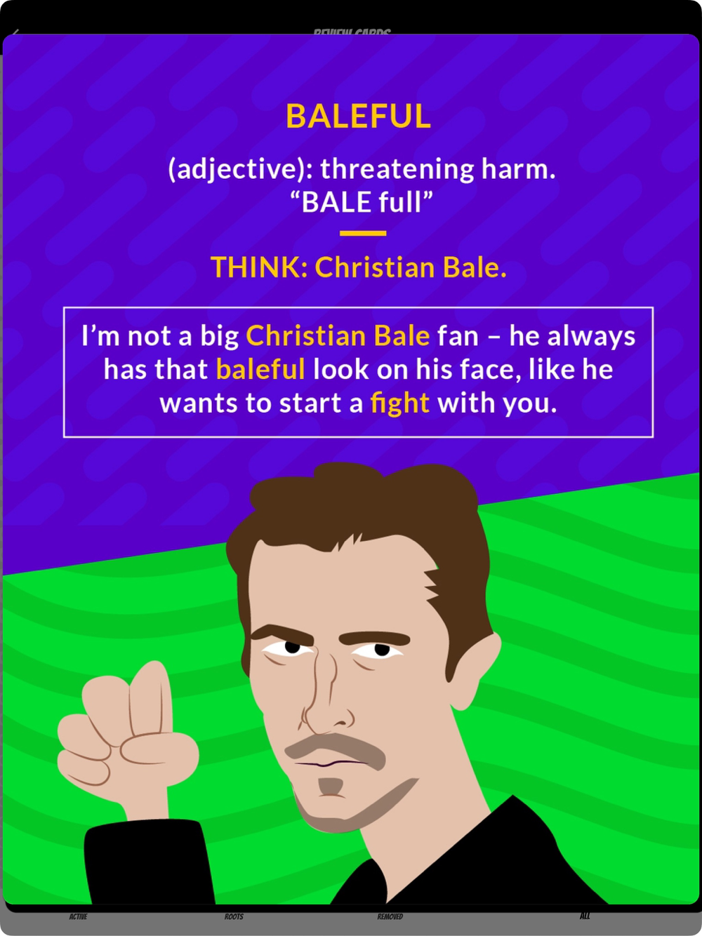 My name is Vince Kotchian, and I've been a GRE prep tutor since 2008. In this app, I've created flashcards for over 1300 GRE words and 160 word roots. Each vocab flashcard has a silly cartoon, a clear definition of the word with an example sentence, and a memorable mnemonic to make it easier to remember the word.