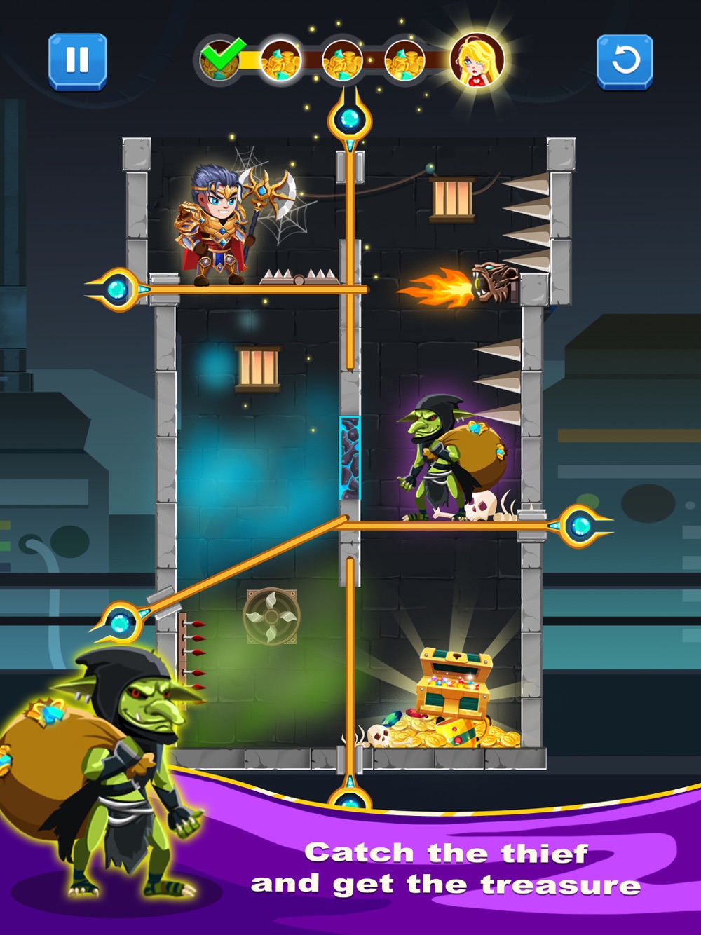 * Pull the Pin Puzzle Mode: Use your brain to kill monsters, pull the pin out, activate traps to take over treasures or rescue your fiancee with traps arranged in the game screen .
