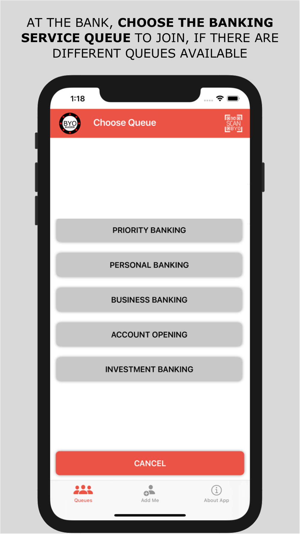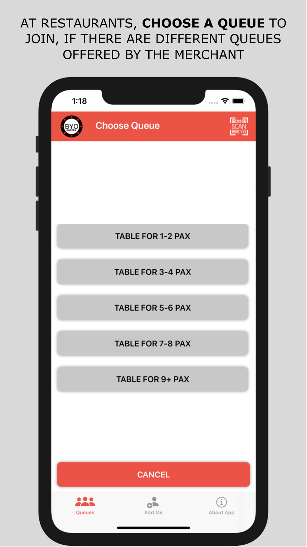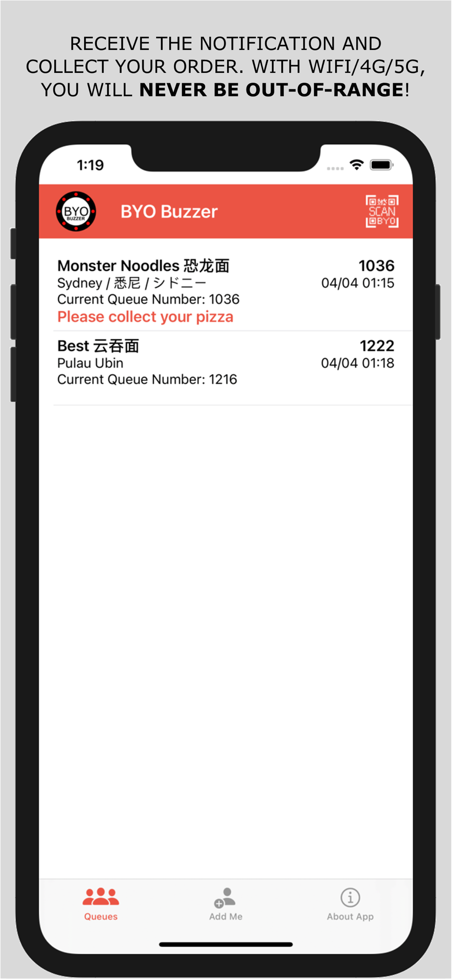 Download BYO Buzzer when joining queues at restaurants, food courts or even at medical care facilities. Scan existing SafeEntry, SGQR, PayNow or any other QR code already pasted on the door/counter to join the queue and go about your own business nearby. You can shop, run errands or sit down somewhere while you wait for your order to be ready.