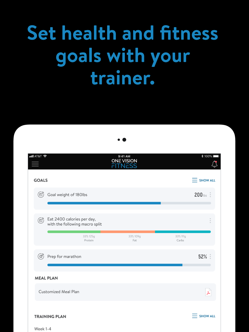 With the One Vision Fitness App, you can start tracking your workouts and meals, measuring results, and achieving your fitness goals, all with the help of your personal trainer.