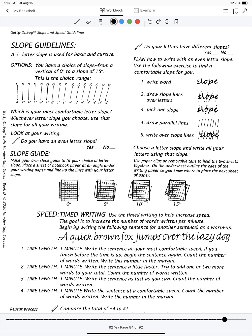 The fun comes when students touch their stylus to the screen. Now they can select the color, width and opacity of the pen line. They trace and copy the handwriting models, reading the instructions and tips as they go. Then, they can erase their work and practice more by selecting the eraser icon to change the stylus function to erase mode, or by erasing the writing on the entire page at once. There are extra practice sheets at the end of the book, too. Students can document their work via the iPad native screenshot function.