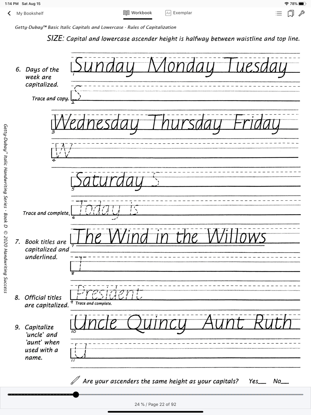 The Getty-Dubay Italic Handwriting Series Book D comes preloaded with the app. Turn pages, scroll, navigate and create bookmarks in the same way you would with an ebook. On the 12.9” iPad Pro, the pages will appear in portrait mode. On smaller iPads, pages will appear in landscape mode and scrolling will allow you to access the entire page. (Screen rotation and zooming are disabled.)