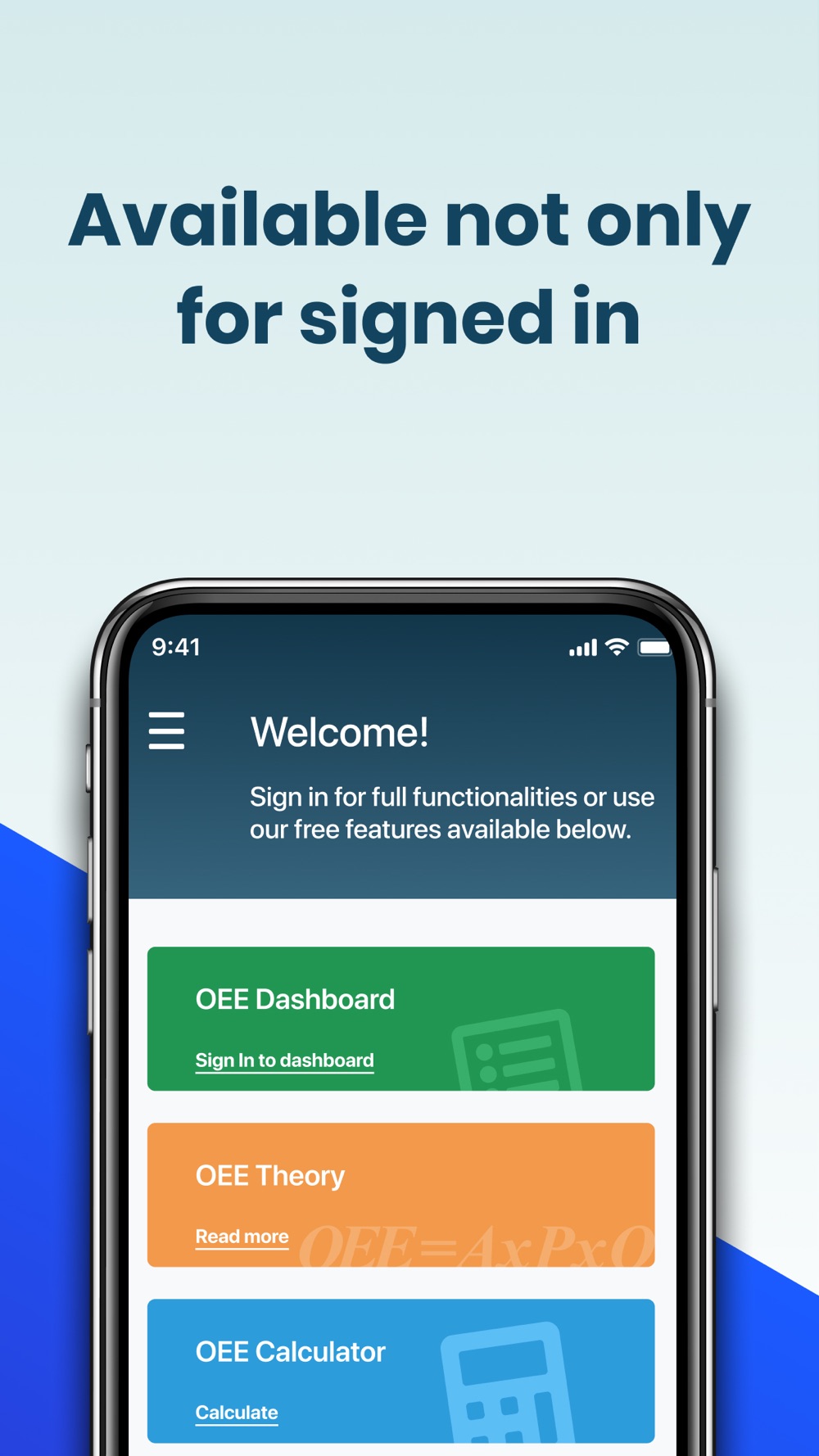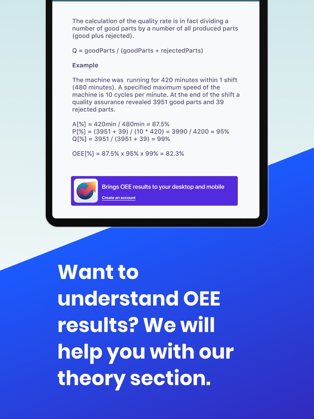 From version 1.1 the application provides features for users that do not have an account. You can read a theory that stands behind the OEE metric and calculate OEE using a simple and easy to use calculator.