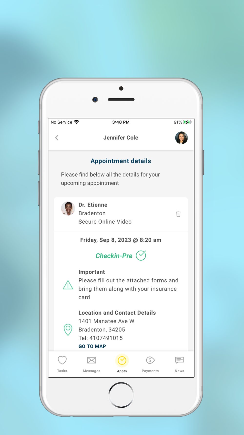 • Fill out your medical history forms, list medications and sign forms prior to your appointment. All done on your phone or tablet in a HIPAA-secure environment.