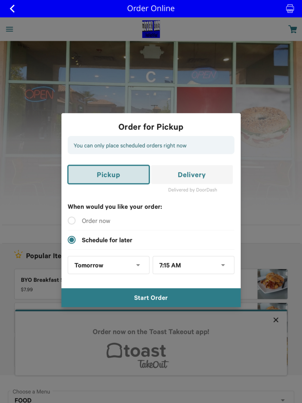 Breakfast restaurant app for mobile ordering on all menu items for pickup and curbside orders.