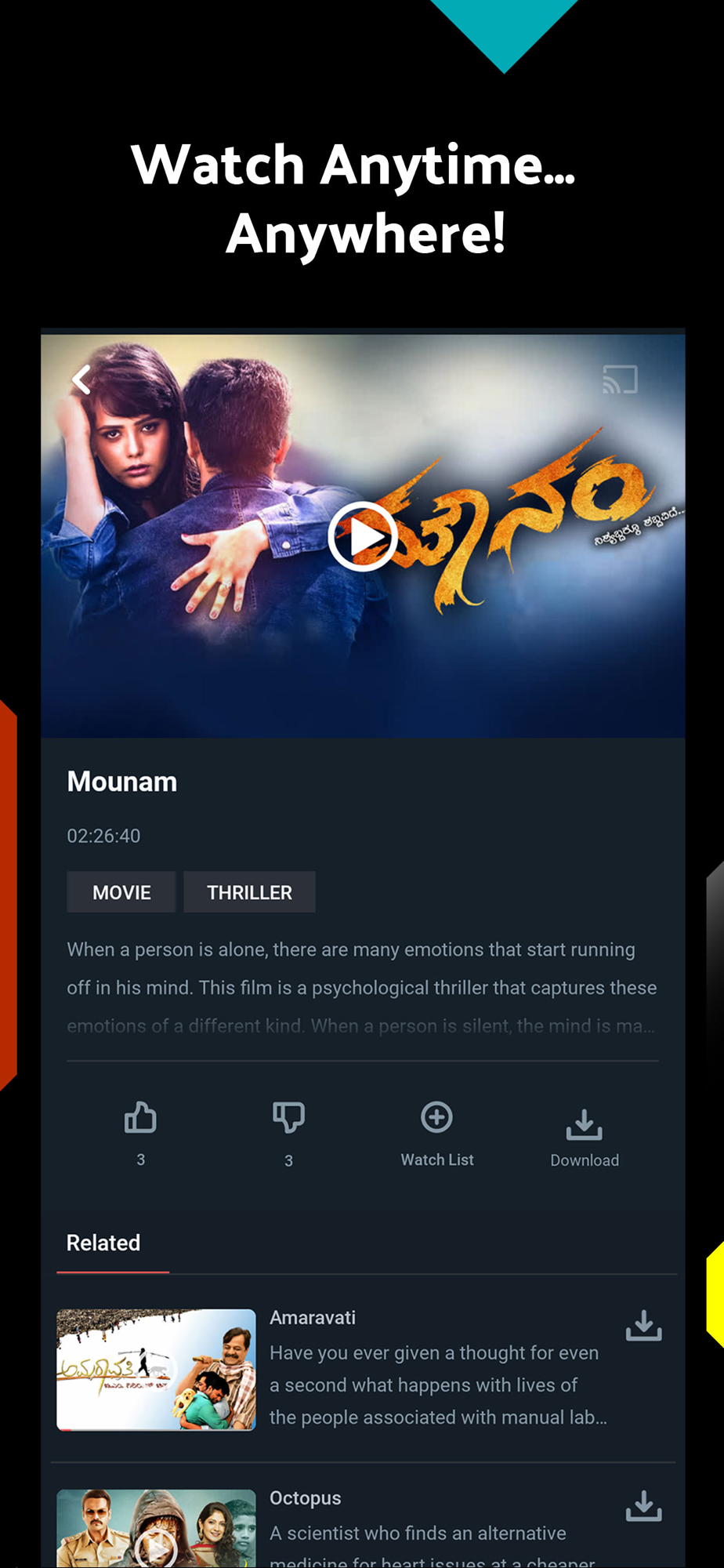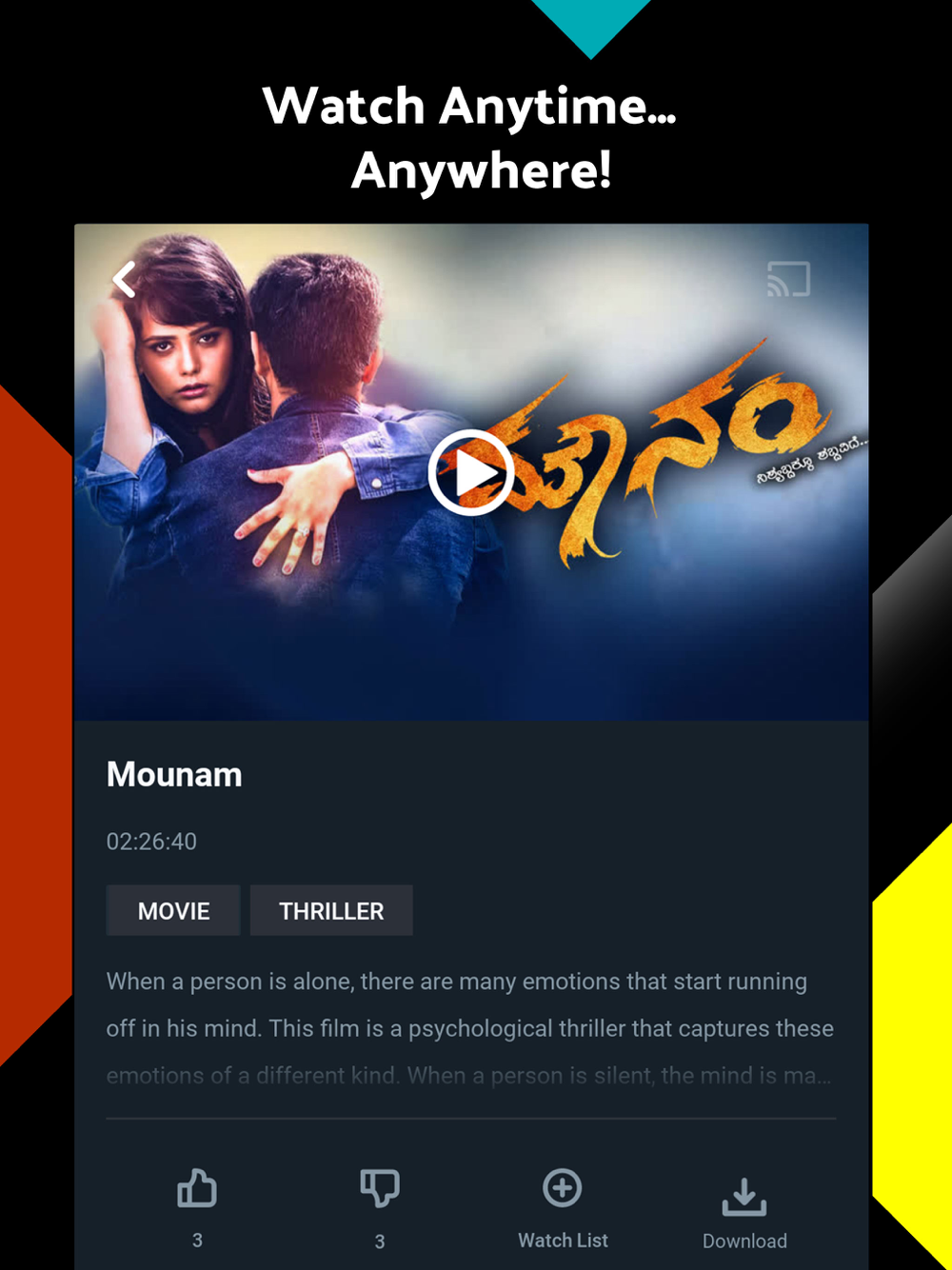 Movies: Ever-growing catalog of Popular Kannada movies catering to different categories, age groups, and genres from classics to latest blockbusters.