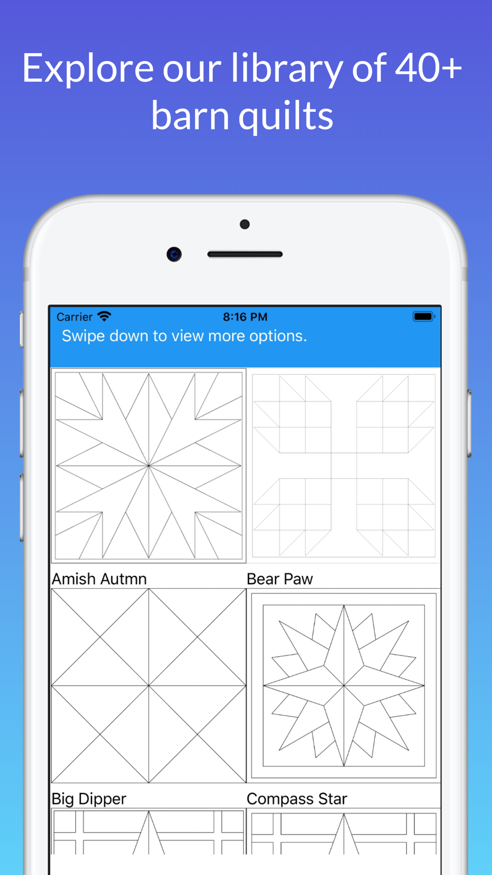 Barn quilts are popping up everywhere. Not just for barns and farms, barn quilts are American art for indoors or out...a front porch, garden shed, fence or over a fireplace mantle. With our app, you can be on your way to designing your own custom piece of art.