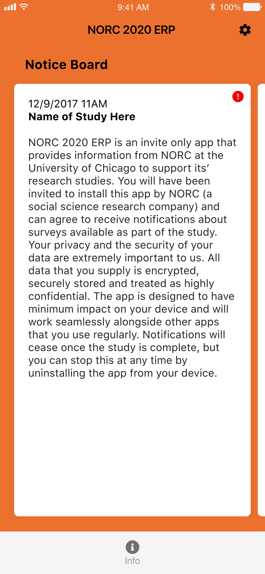 NORC 2020 ERP is an invite only app that provides information from NORC at the University of Chicago to support its' research studies. You will have been invited to install this app by NORC (a social science research company) and can agree to receive notifications about surveys available as part of the study. Your privacy and the security of your data are extremely important to us. All data that you supply is encrypted, securely stored and treated as highly confidential. The app is designed to have minimum impact on your device and will work seamlessly alongside other apps that you use regularly. Notifications will cease once the study is complete, but you can stop this at any time by uninstalling the app from your device.