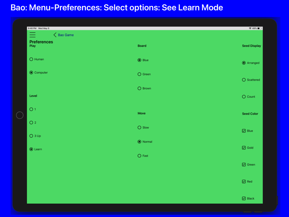 Beautiful sets of colors are provided for user to select and use for board and seeds. These color options are available on selection of Menu > Preferences.