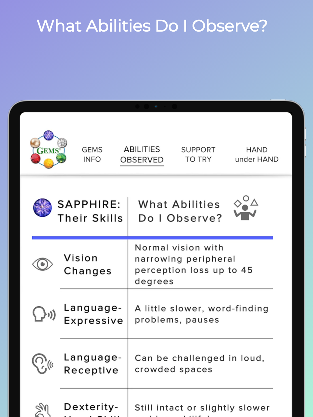 Teepa Snow and Positive Approach to Care (PAC) believe that when caring for people living with dementia those of us with healthy brains must be willing to change and adapt. With this essential GEMS app, you can join us in this mission by learning about the GEMS State Model, a scale that focuses on abilities that are retained throughout the progression of dementia. This app will help you learn the characteristics of each GEMS state and ways to provide the optimal care for that state. The app includes a dementia scale comparison chart, video clips of Teepa Snow explaining each GEMS state, and video and photos depicting our Hand-under-Hand technique to guide and assist with everyday tasks. The GEMS app will help shift the way that you understand and provide care for those living with brain change.