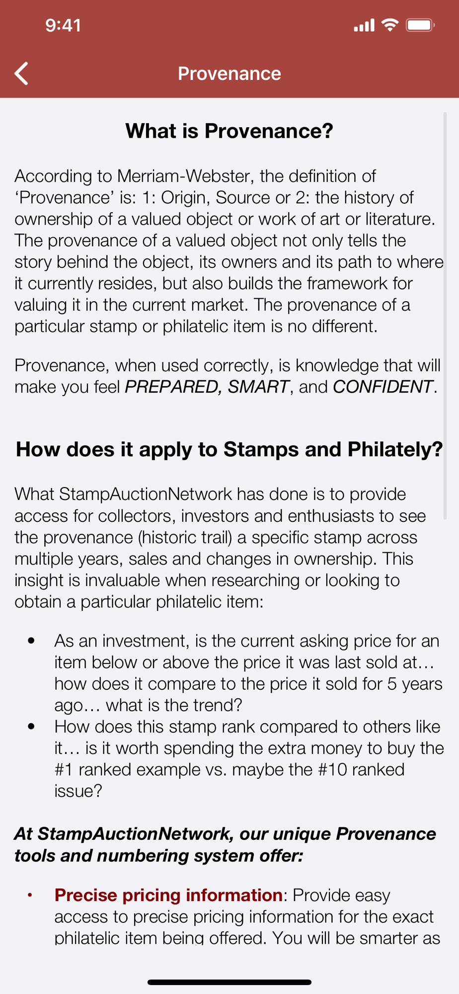 • LEVERAGING PROVENANCE - Access StampAuctionNetwork’s publication detailing how the provenance tools at StampAuctionNetwork are integrated throughout the platform and can be used by the collector and investor to gain a competitive advantage when obtaining philatelic material.